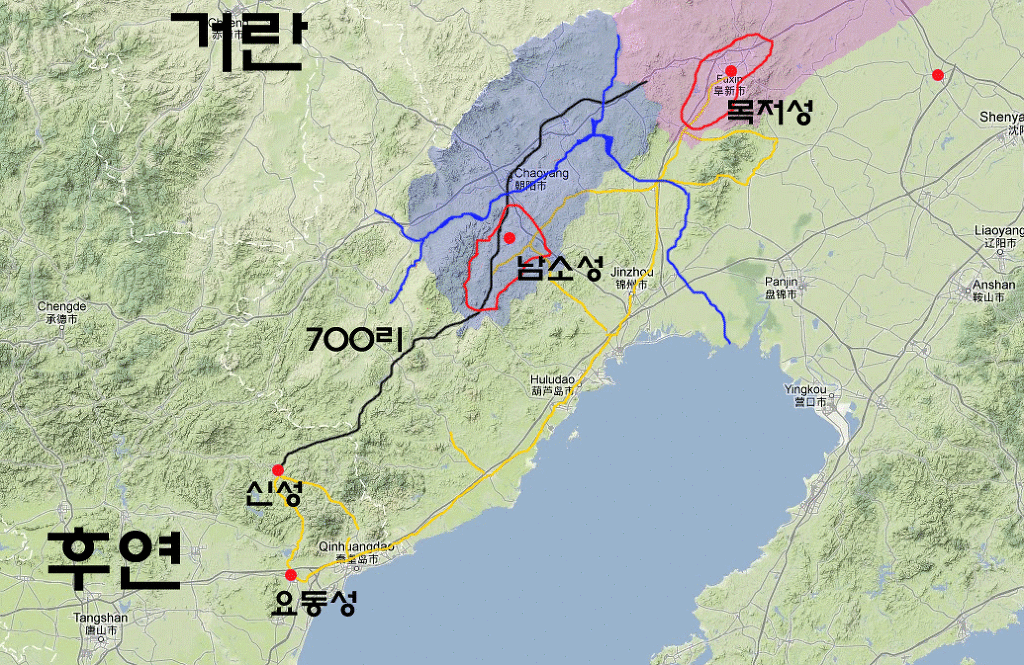 위 그림의 남소성과 목저성의 위치는 정확한 위치 비정을 한 것이 아닌 대략적으로 갸늠해 본 것이다. 붉은색 선 지역은 국경을 고려하였을 때 번화가가 있었을 것으로 생각되는 지역이며, 남소성이 위치하고 있는 푸른색 영역은 현 조양시의 행정구역이다.
