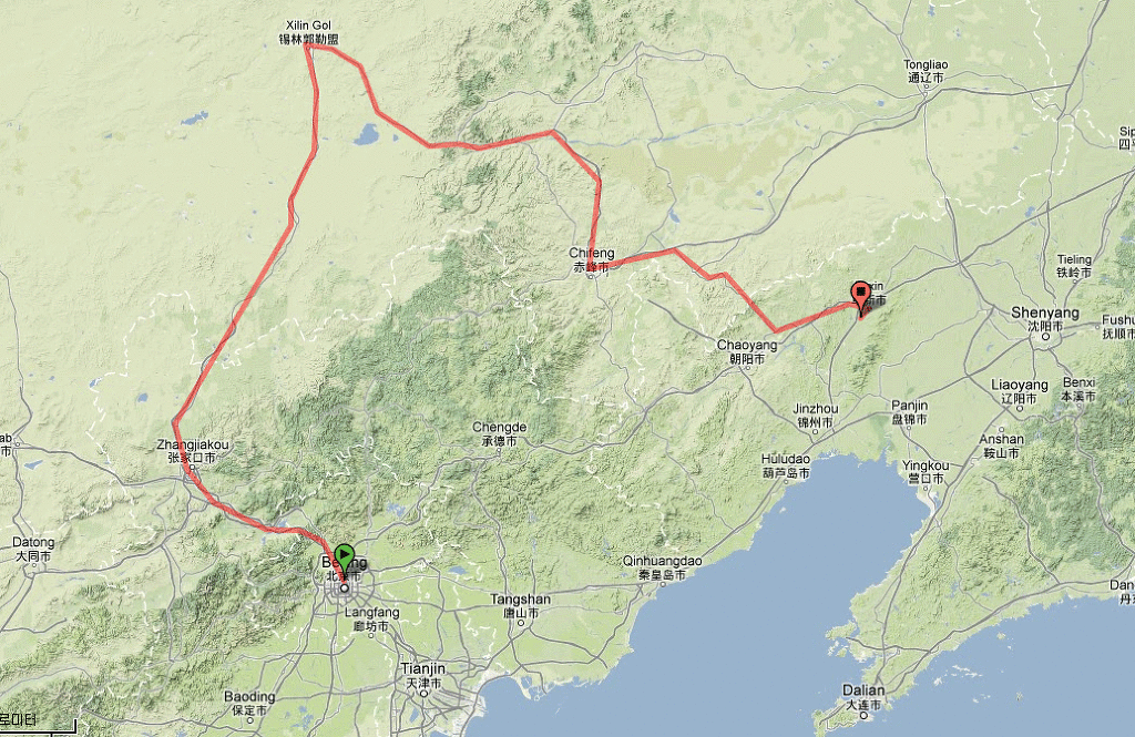 끝으로, AD 406년에 연왕이 3000리를 행군한 후 목저성을 공격한다는 내용이 있다. 그런데 목저성을 공격하기 위해 간 것이 아니라 거란을 치기 위해 갔다가 적의 수가 많아 퇴각하는 과정에서 목저성을 쳤다는 것이다. 3000리면 1200km의 거리이다. 후연의 군대가 북경지역에서 출발하였다면 경로는 아래 그림과 같을 것이다(붉은색 거리 : 대략 1200km임). 그리고 목저성을 공격한 이유는 단순히 식량을 확보하기 위해서 한 것이 아닐까 생각된다. 공격 실패후 병사들 대부분 굶어죽었다는 것으로 보면...