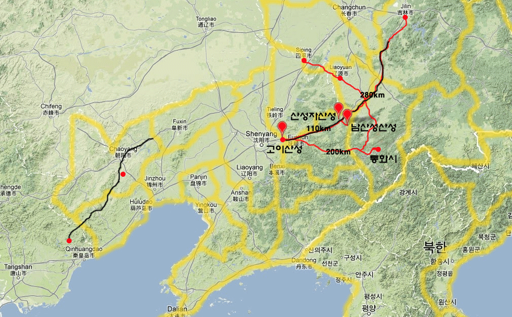 그런데 이 지역은 독립된 곳입니다. 다른 표현으로 하면 삼면이 산으로 막혀 있는 고립된 곳이기도 합니다. 산 사이로 길이 있을 것으로 생각은 들지만 일단 큰 길은 보이질 않는군요. 고이산성쪽으로 가려면 산성자산성쪽으로 나와서 가야 하며, 통화시로 가려고 해도 한참을 돌아가야 합니다. 고이산성에 280Km 거리가 어느정도인지를 체크해 봤더니, 아래 그림의 검은색 선이 끝나는, 길림시 근처까지 뻗칩니다. 현재의 행정구역을 통해 280km 라인을 검토해 봤지만 해당사항이 없습니다.