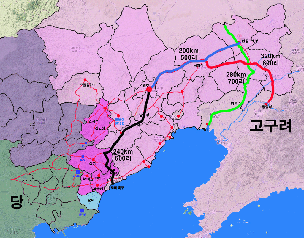 위 그림은 건안성과 안시성의 위치 관계를 능원시의 주요 이동로를 통해 분석해 본 것입니다.
