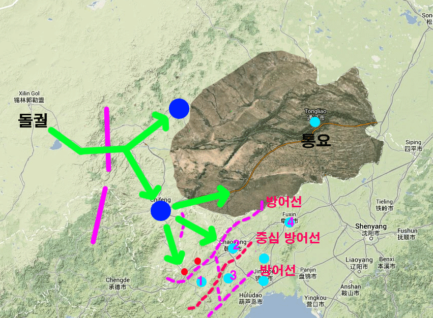 위 그림은 대흥안령산맥을 넘어 동쪽으로 진격을 했을때 지리적 특징을 살펴본 것입니다.