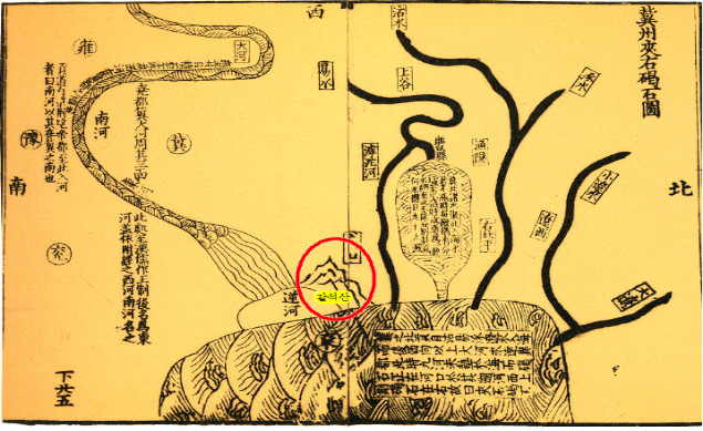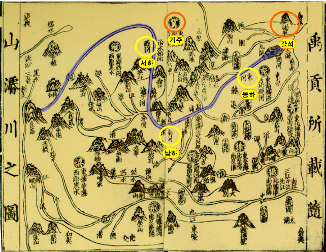“치수와 공부를 살펴보면 제도(帝都, 기주)로부터 시작했다. 황하는 승주 동쪽에서 시작하여 곧바로 남으로 화음에 이른다. 또 동쪽으로 회주 남쪽에 이르고, 또 동북으로 평주 갈석산에 이르러 바다로 들어간다. 동하의 서쪽, 서하의 동쪽, 남하의 북쪽이 모두 기주이다(按理水及貢賦 從帝都爲始也. 黃河自勝州東, 直南至華陰, 卽東至懷州南, 又東北至平州碣石山入海也.東河之西, 西河之東, 南河之北, 皆冀州也)” 『사기』‘권2 하본기’ ‘기주冀州’ 주석