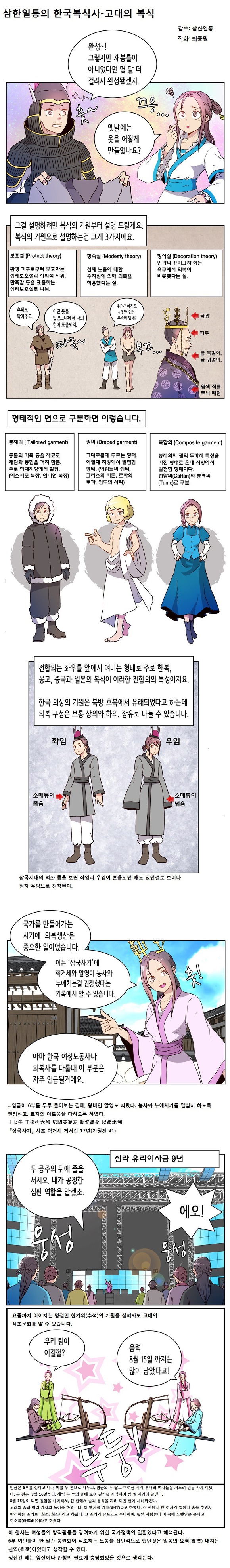 유(襦)라는건 중국에서 그들의 긴 길이의 포(袍)에 비해 짧은 상의를 가리키는 말이었던걸로 생각되며 우리나라에서 착용된 상의는 좌임(左衽)이며, 적령교임식의 엉덩이선까지 길이로 소매통은 좁고 보통 옷의 가장자리에 선을 두르고 있었다. 허리에는 띠를 둘렀다.