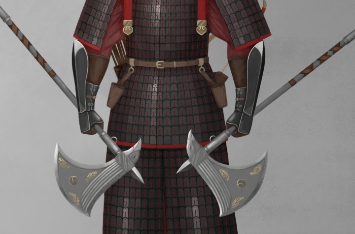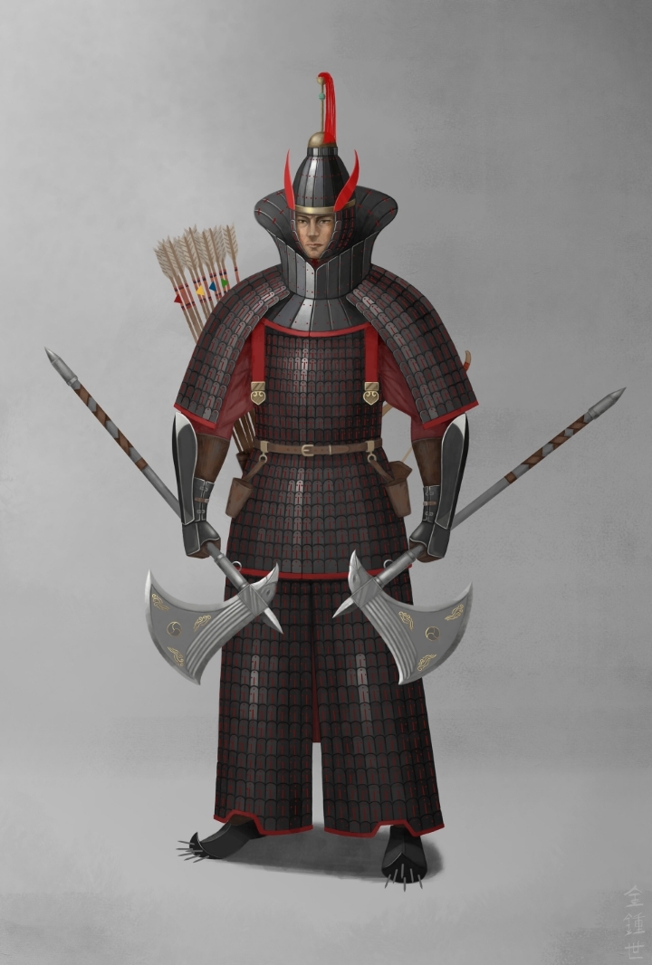 투구대신 책(절풍)을 쓴 걸로 보지만 갑옷을 입고 약간의 위압갑을 묘사하는 건 나쁘지 않다고 봅니다. 부월을 두개 드는 대신 창수처럼 방패들고 전투에 나가는 게 더 바람직하군요 -