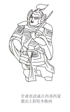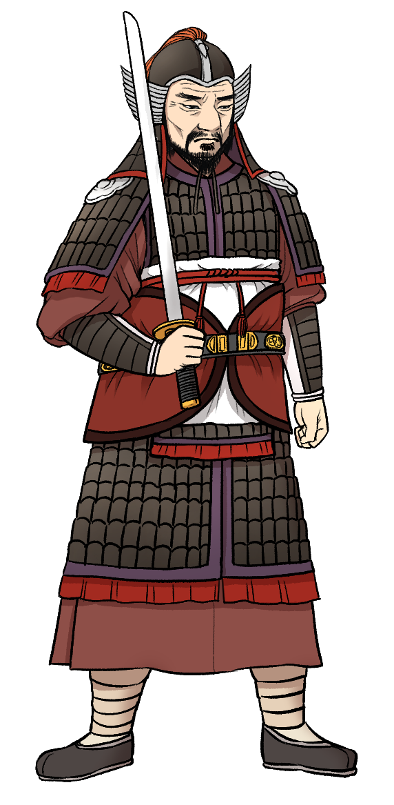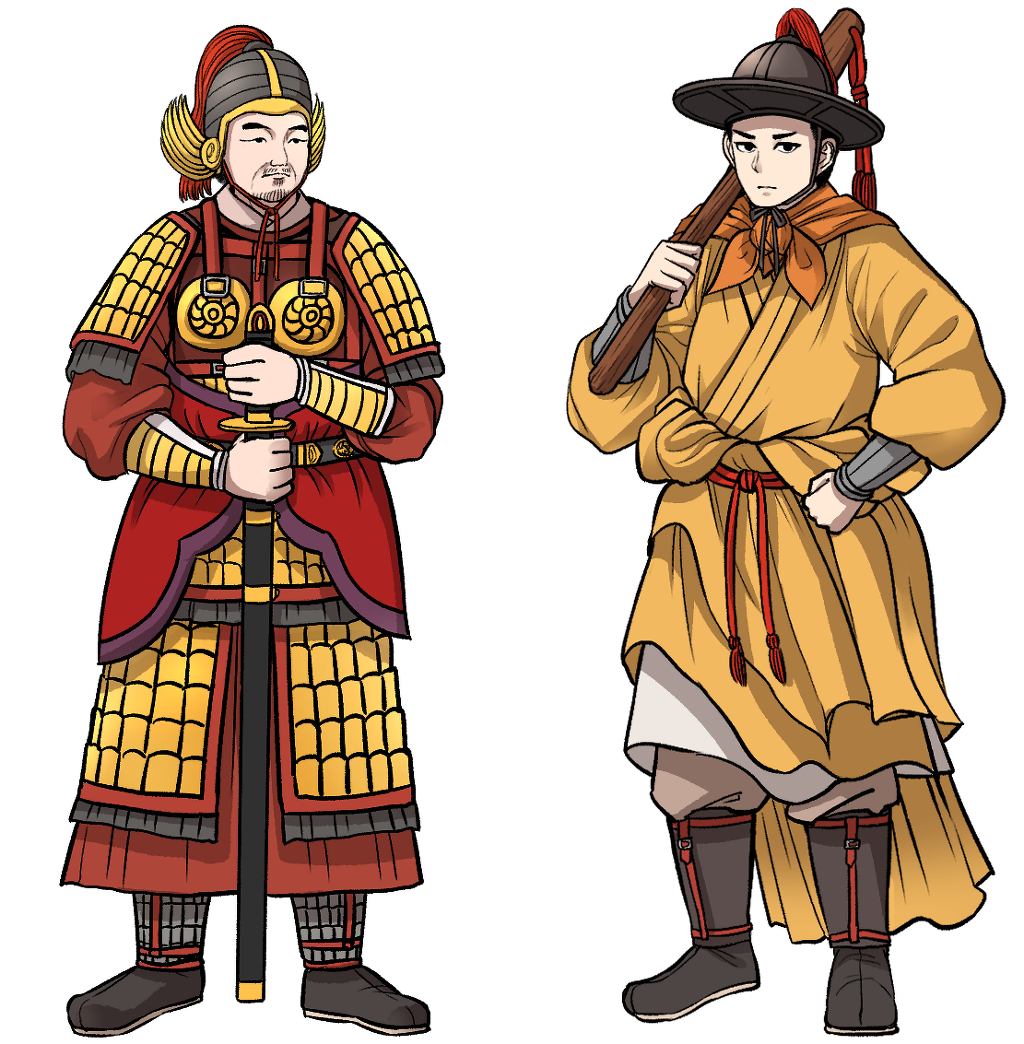 다음으로 우측 인물을 살펴보면, 봉시식이 달린 투구에, 가로로 그어진 선을 보아, 찰갑을 입은 것으로 추측됩니다. 동면의 무인과 비슷하게 피박을 착용하고 속갑반과 가죽띠를 착용한 모습으로 그려보았습니다.