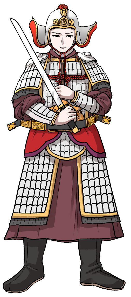 먼저 동쪽 면 좌측의 암각화를 토대로 그려본 갑옷입니다. (우측 팔부중의 경우 목에 두른 뱀 때문에 갑옷이 가려져서 제외했습니다.) 대체적인 모습은 송나라의 갑주와 유사합니다. 투구의 경우 양옆에 봉시식(鳳翅飾)이 있는 송나라식 투구로 그렸고, (암각화에선 팔부중의 머리카락을 묘사한 것으로 보입니다) 갑옷의 경우 목부분의 둥근 선과 아래로 내려오는 두 개의 선, 그리고 가슴 부분을 지나는 하나의 선을 보아, 아래에 찰갑을 받쳐 입고, 피박(披膊)을 걸친 형식으로 추정했습니다. (단순히 삼국시대 부터 내려온 포형 갑옷을 묘사한 것일 수도 있습니다.) 마지막으로 갑옷 위에 흰색과 붉은색의 포두(袍肚)를 걸치고 가슴에 속갑반(束甲絆)을 묶었으며 허리 부분에 혁대를 묶은 형식으로 그렸습니다.