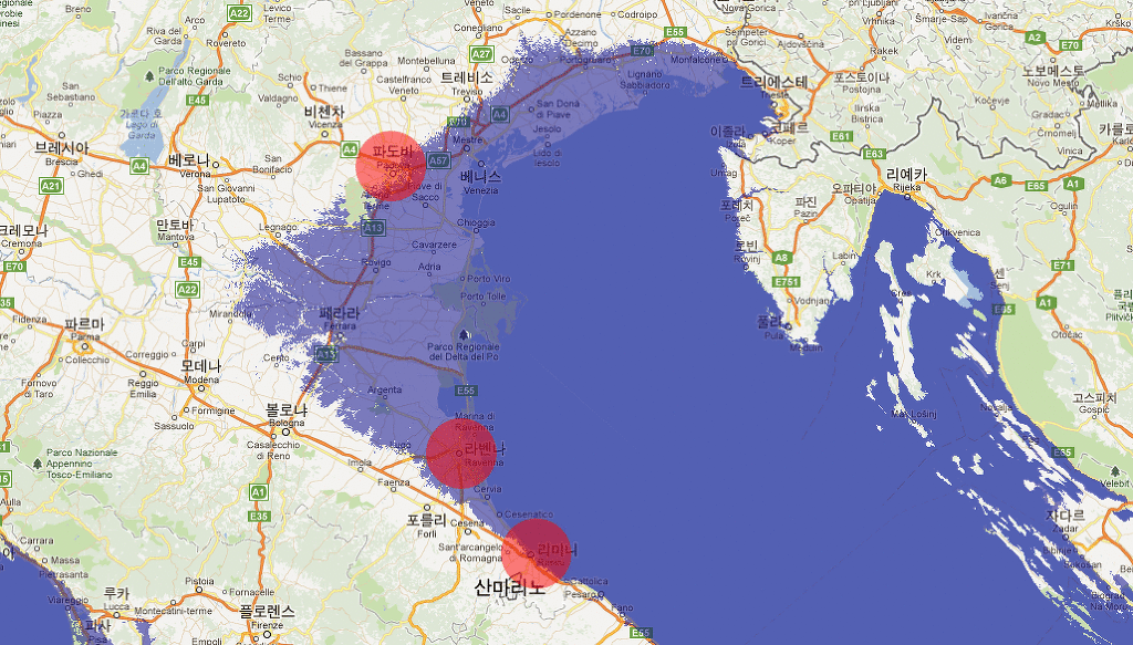 파도바를 중심으로 해안가를 따라 선을 긋다보면 도시들이 그려집니다.