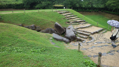 만요문화관은 만엽집을 소개하는 박물관인데 위층은 그림이 전시되어 있고 아래층은 당시 만엽집 시대 문화를 보여주는 모형이 전시되어 있었다. 만요문화관 위층에서 들어가다 보면 유리창 아래쪽으로 유적 하나가 보였다. 동전을 생산하던 유적인데 일본인 가이드가 와서 설명을 해주셨는데 일본어를 모르는 나는 무슨 소리를 하는지 알 수가 없었다. 가이드도 우리 한국인들에게 어떻게든 설명을 해주려고 애는 쓰셨다. 주위에 무슨 말인가 물어보았는데 관산성 전투 당시 성왕이 기술자를 보내주고 왜군을 지원받았다는 내용이라고 하였다. 나중에 확인해보니 만요문화관 위층은 전혀 사진을 찍지 못했다. 비를 맞아서 정신도 없었고 사진 촬영이 안 되는 곳이 많았던 것 같았다.