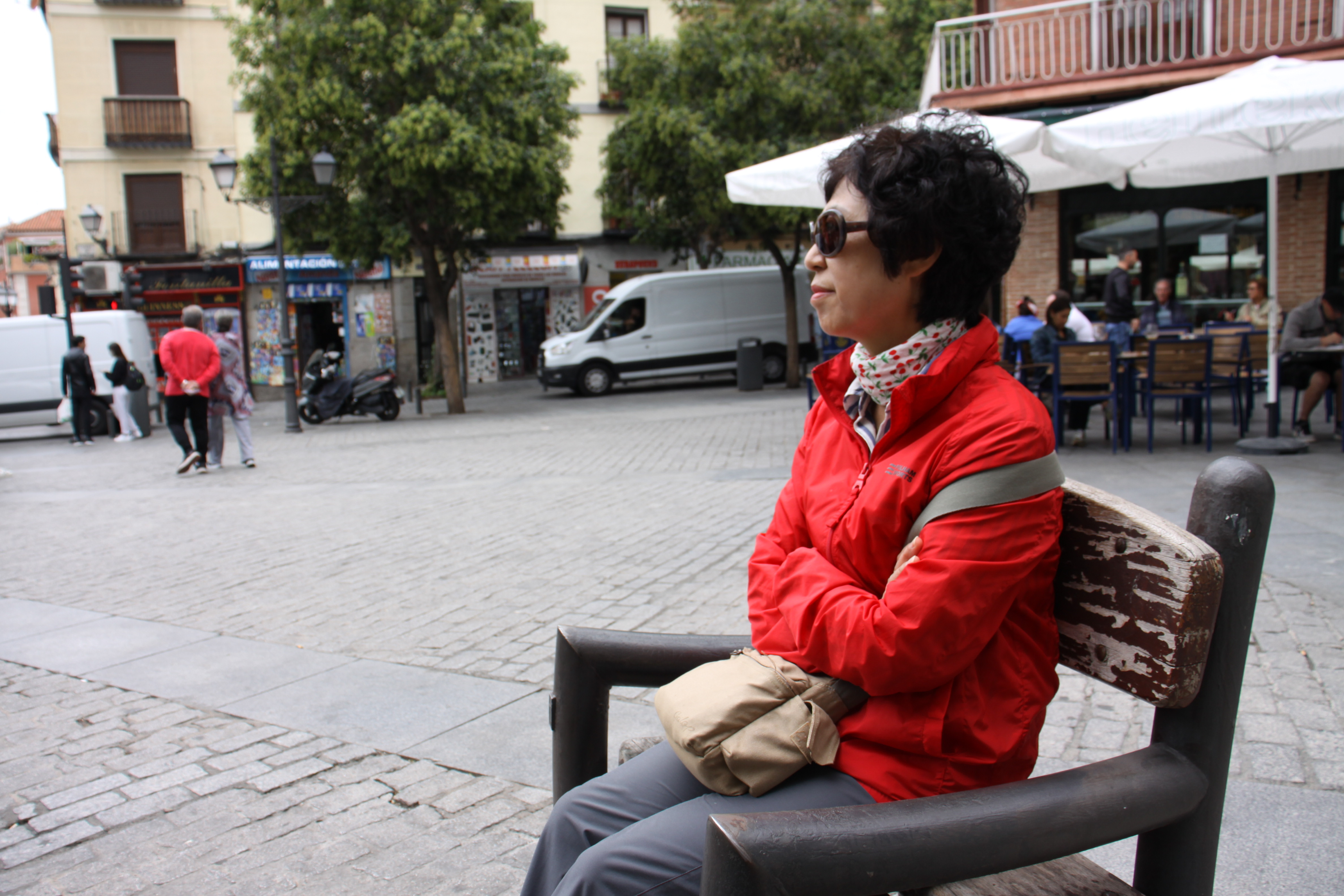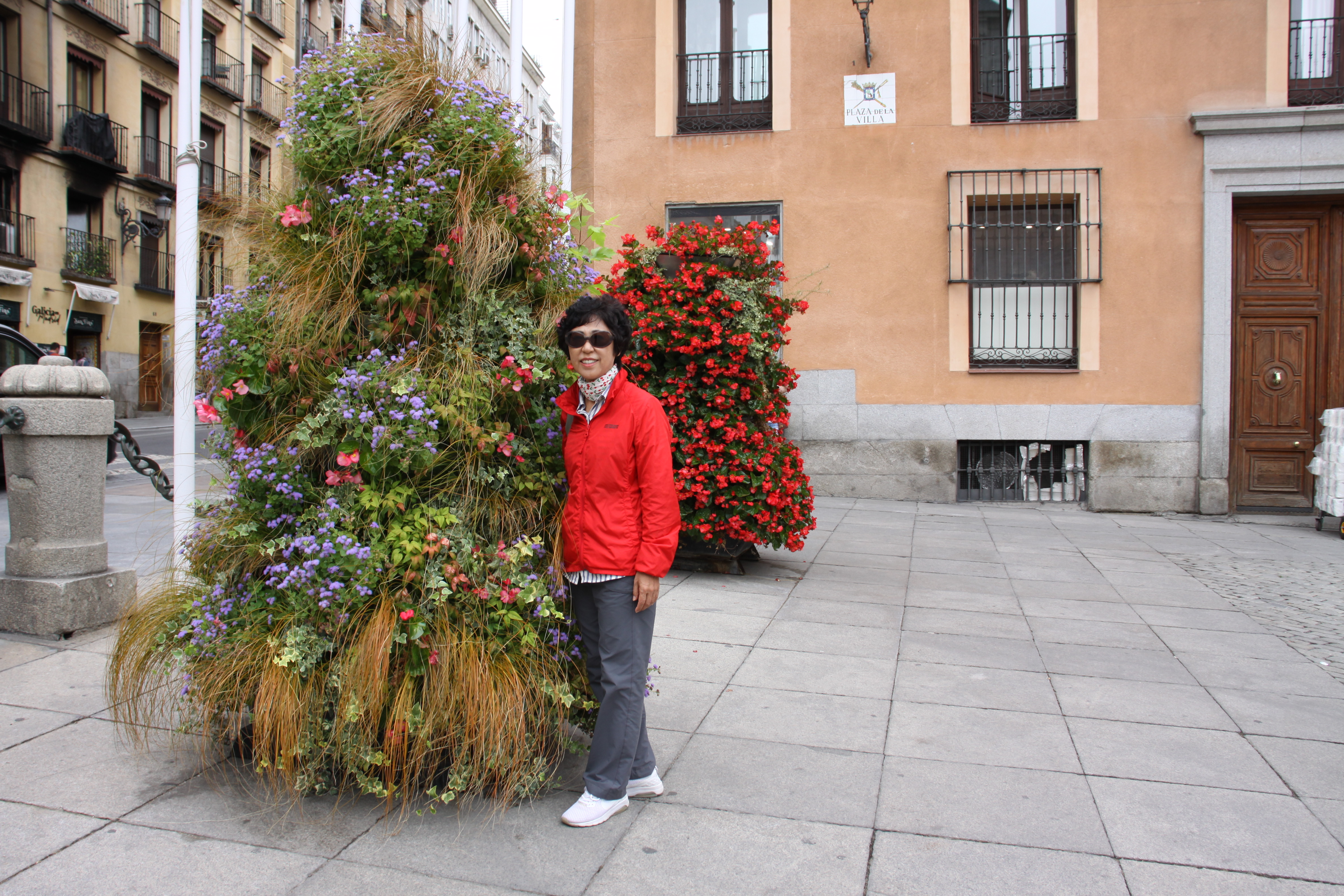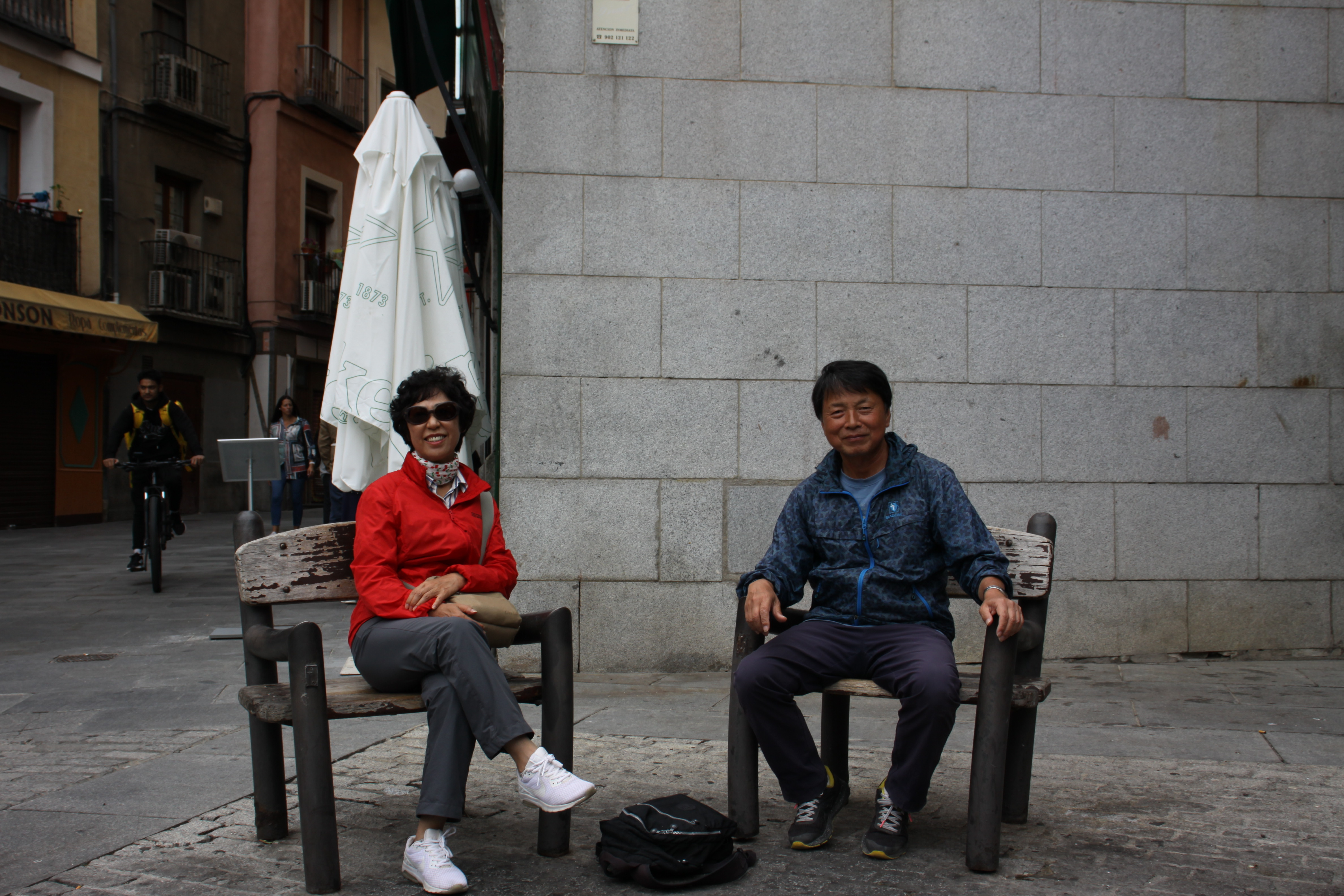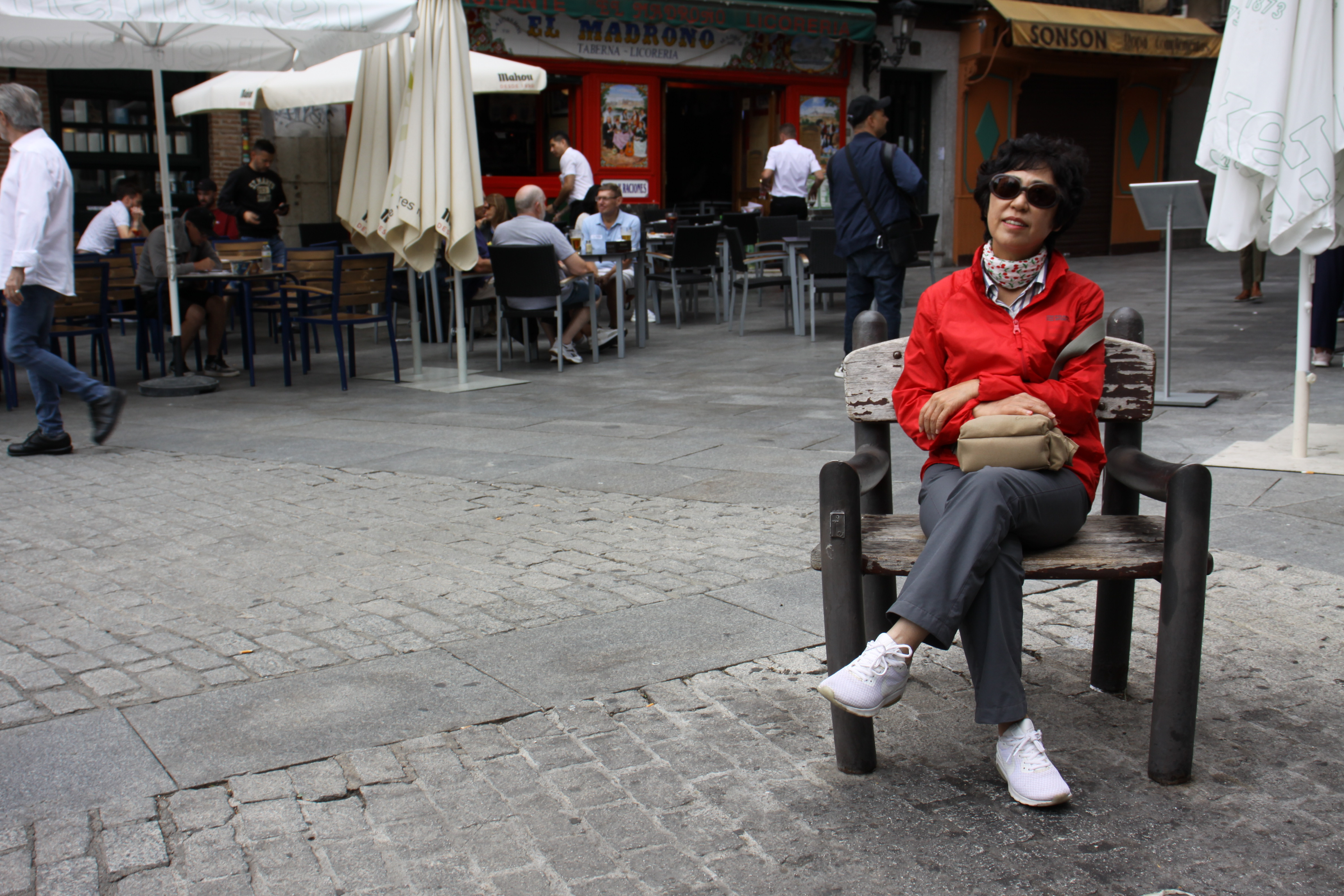 정사각형 받침대에 놓여 있다. 나무 의자가 있어서 아내와 앉아서 쉰다. 사진을 찍으며 즐거워한다. 다시 일어나 마요르 광장으로 들어간다.