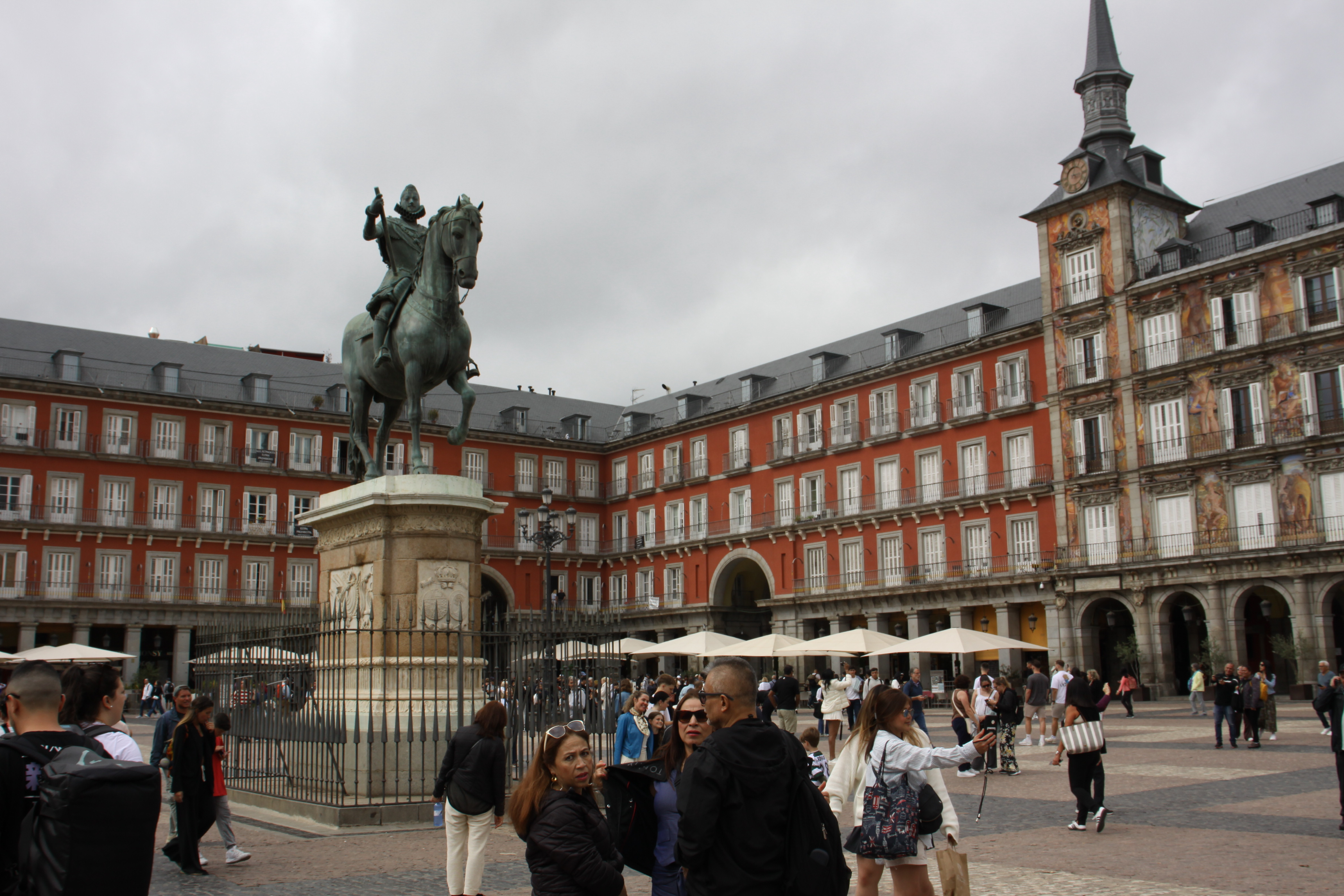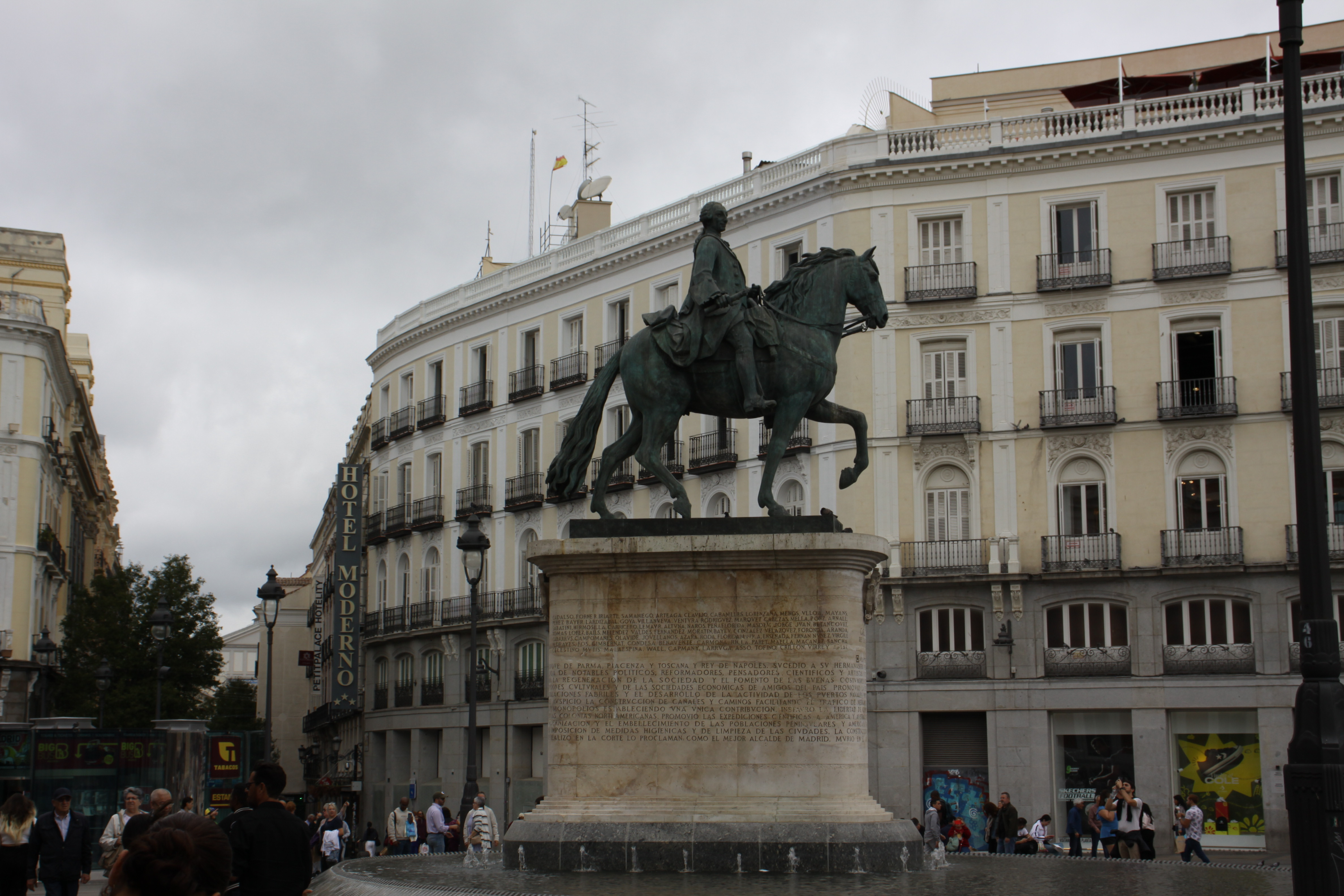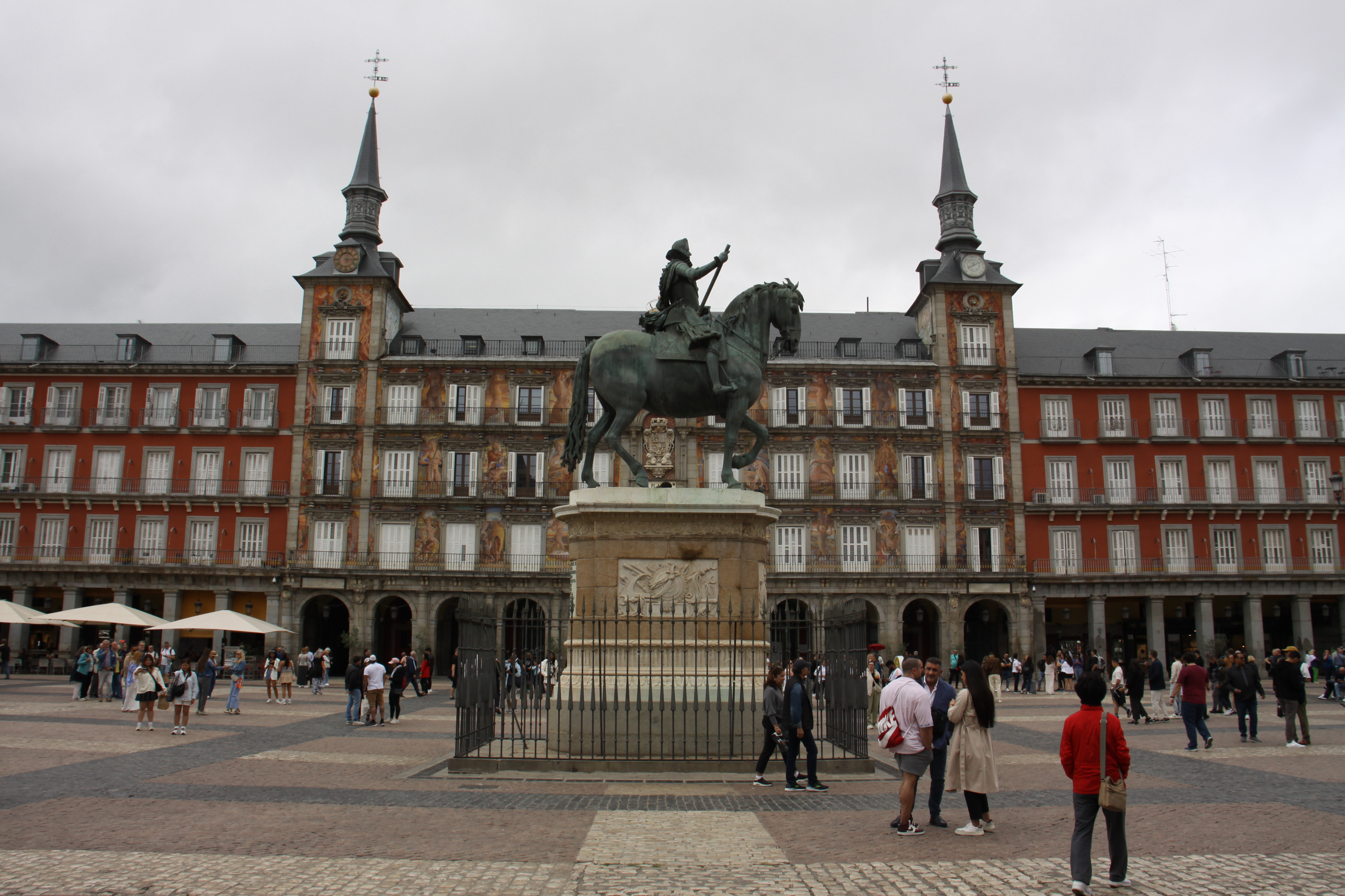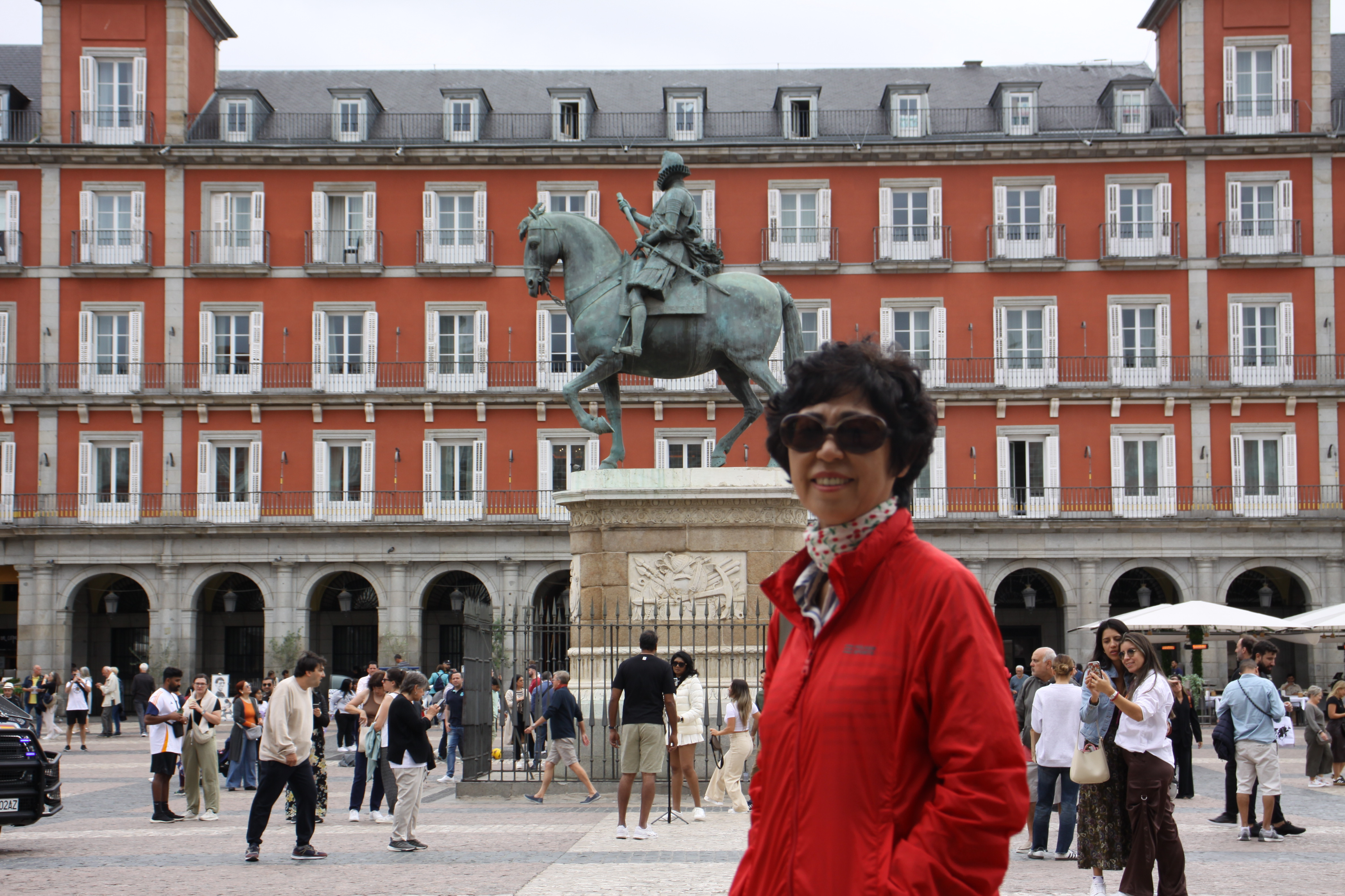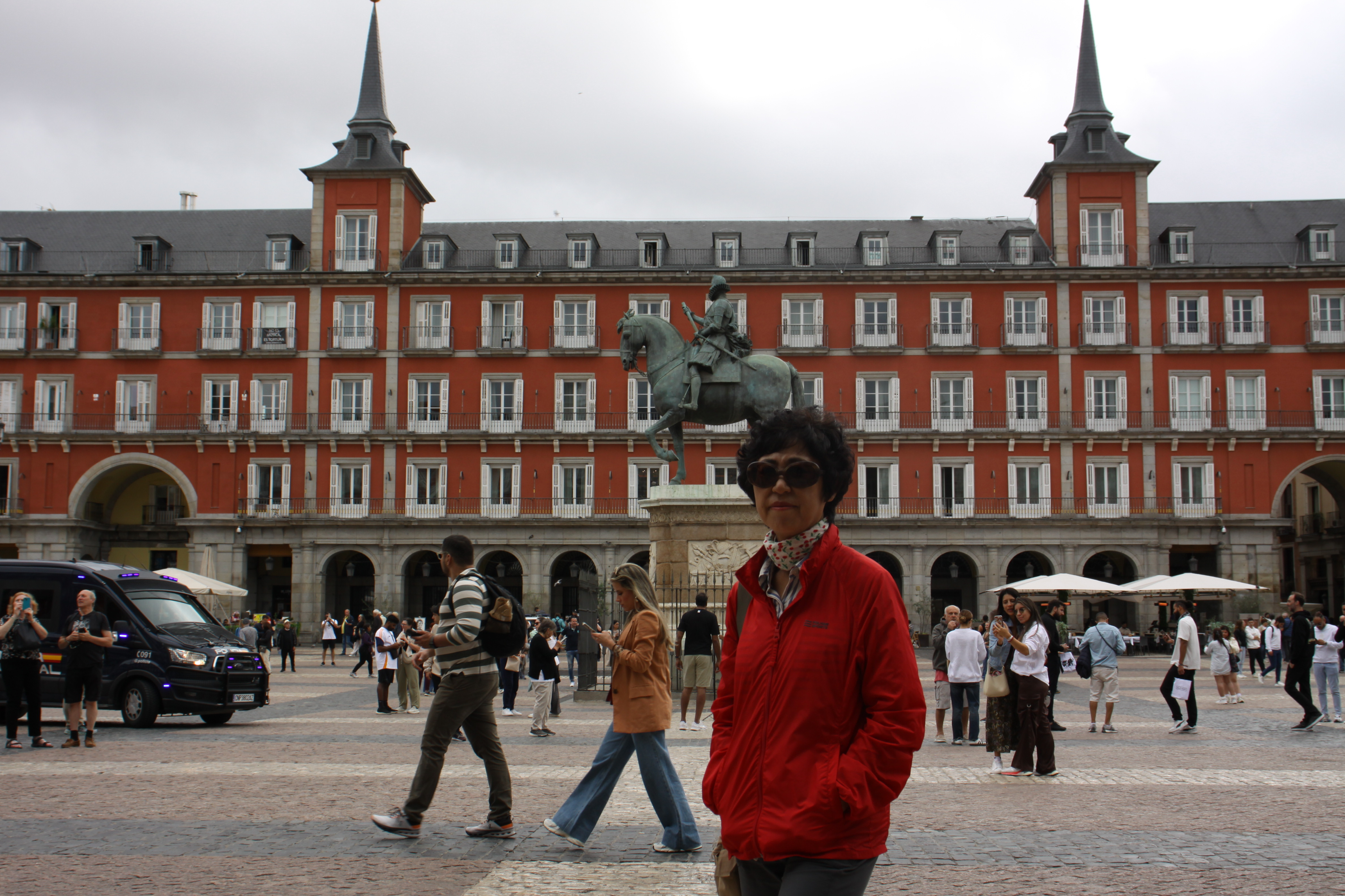정사각형 받침대에 놓여 있다. 나무 의자가 있어서 아내와 앉아서 쉰다. 사진을 찍으며 즐거워한다. 다시 일어나 마요르 광장으로 들어간다.