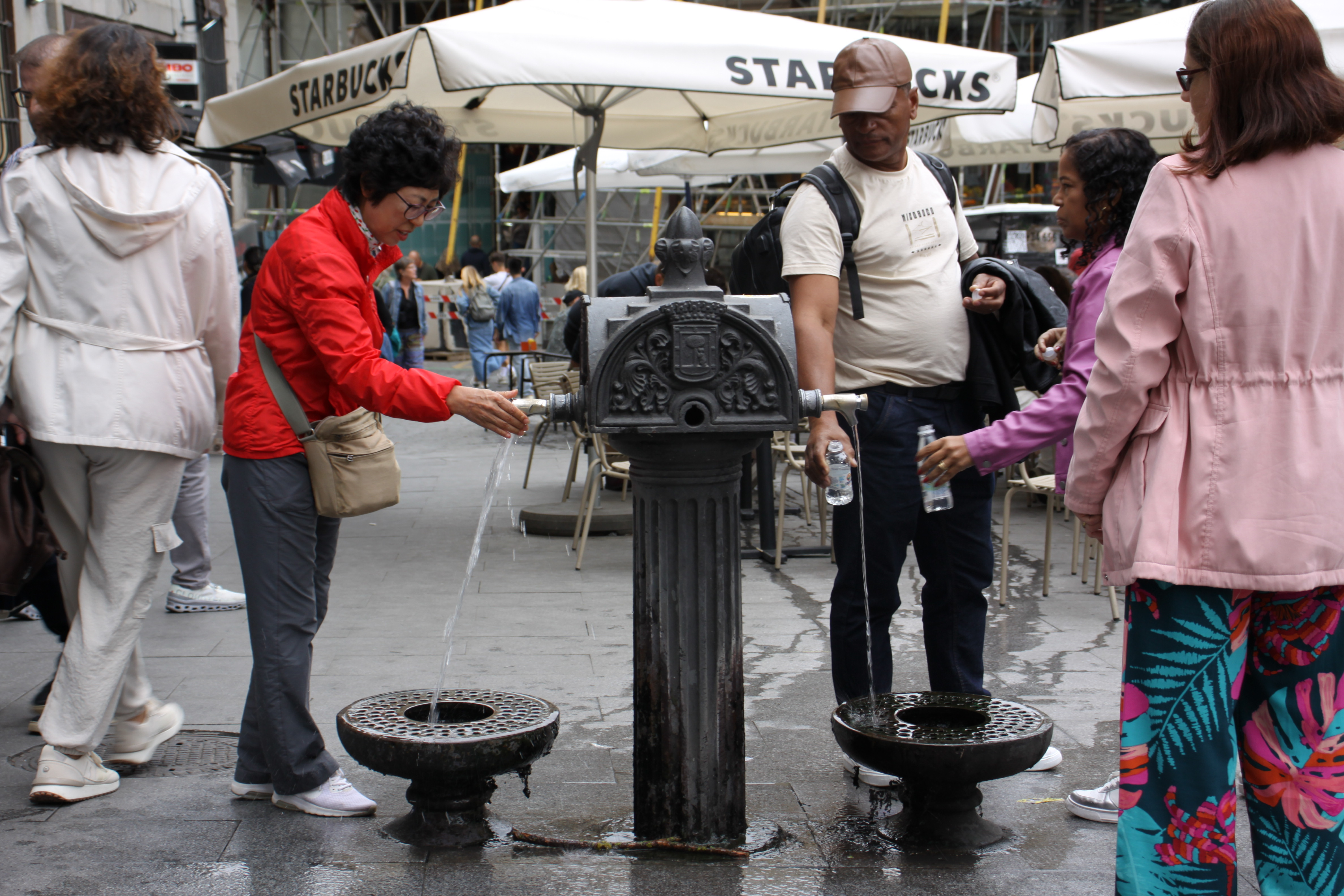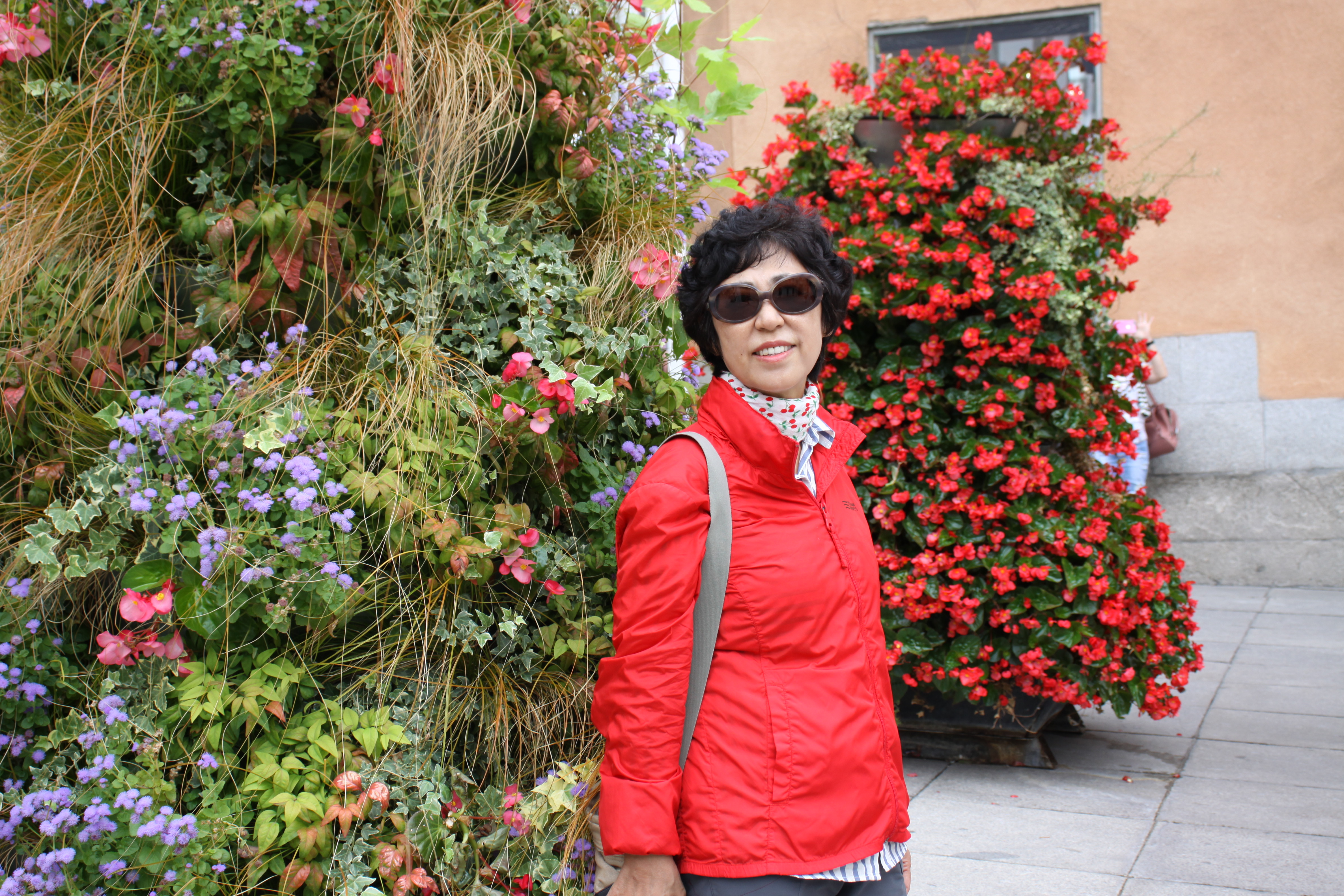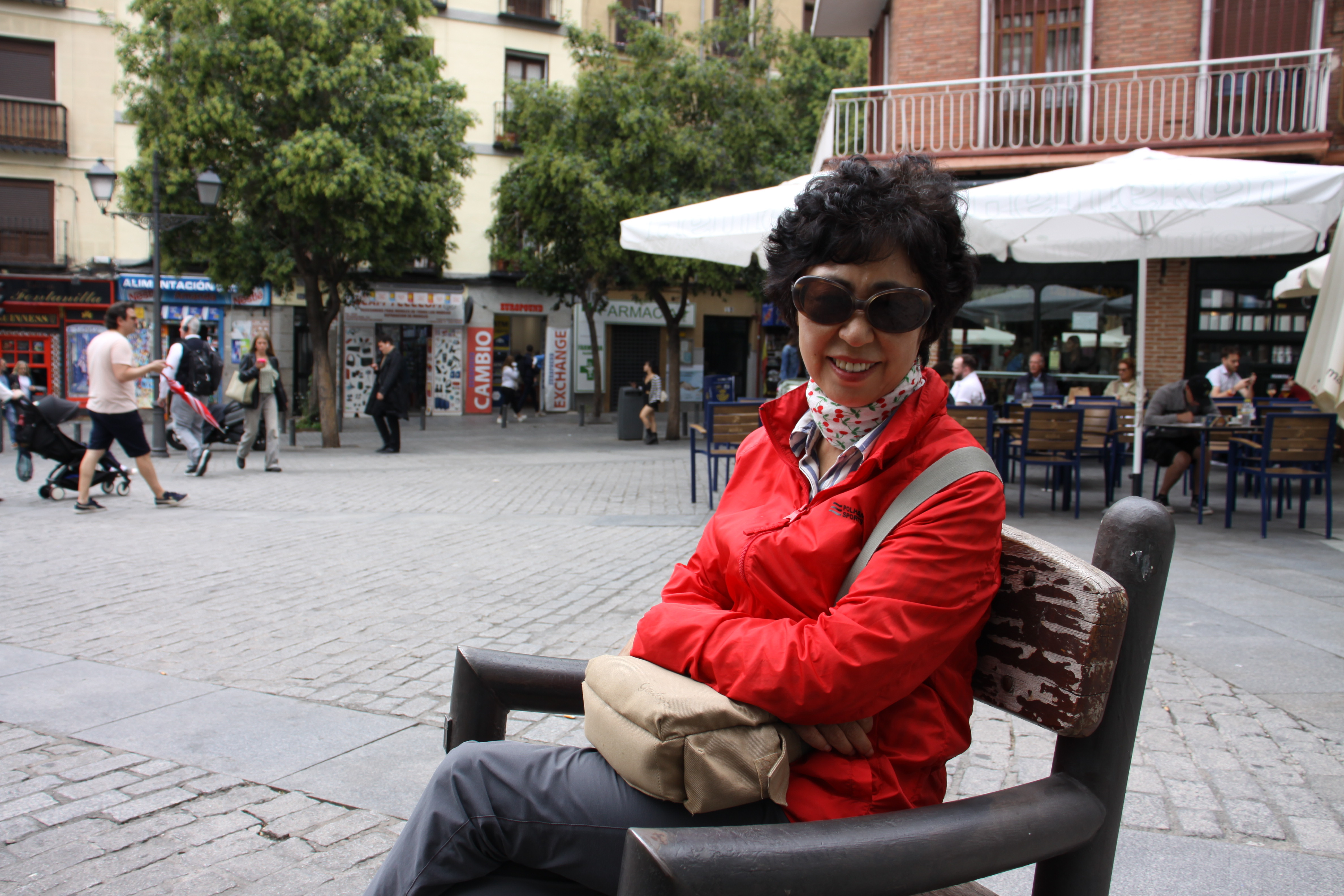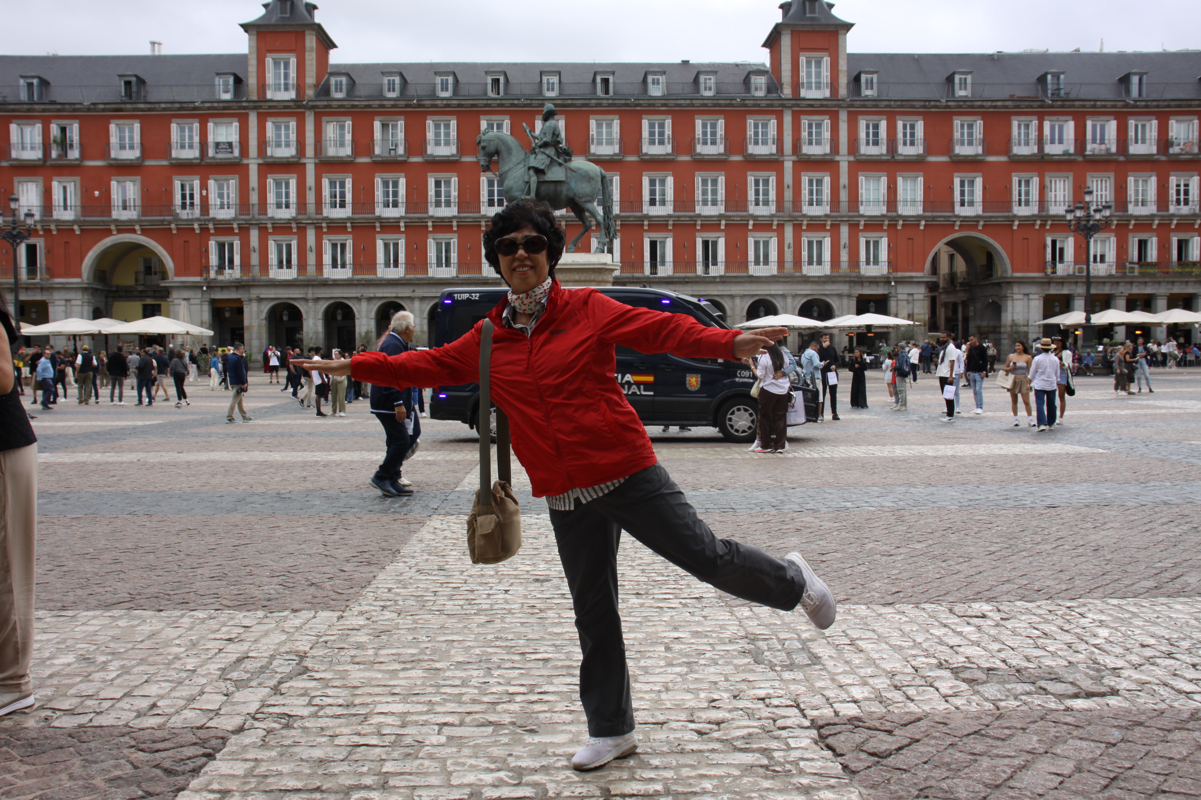 정사각형 받침대에 놓여 있다. 나무 의자가 있어서 아내와 앉아서 쉰다. 사진을 찍으며 즐거워한다. 다시 일어나 마요르 광장으로 들어간다.