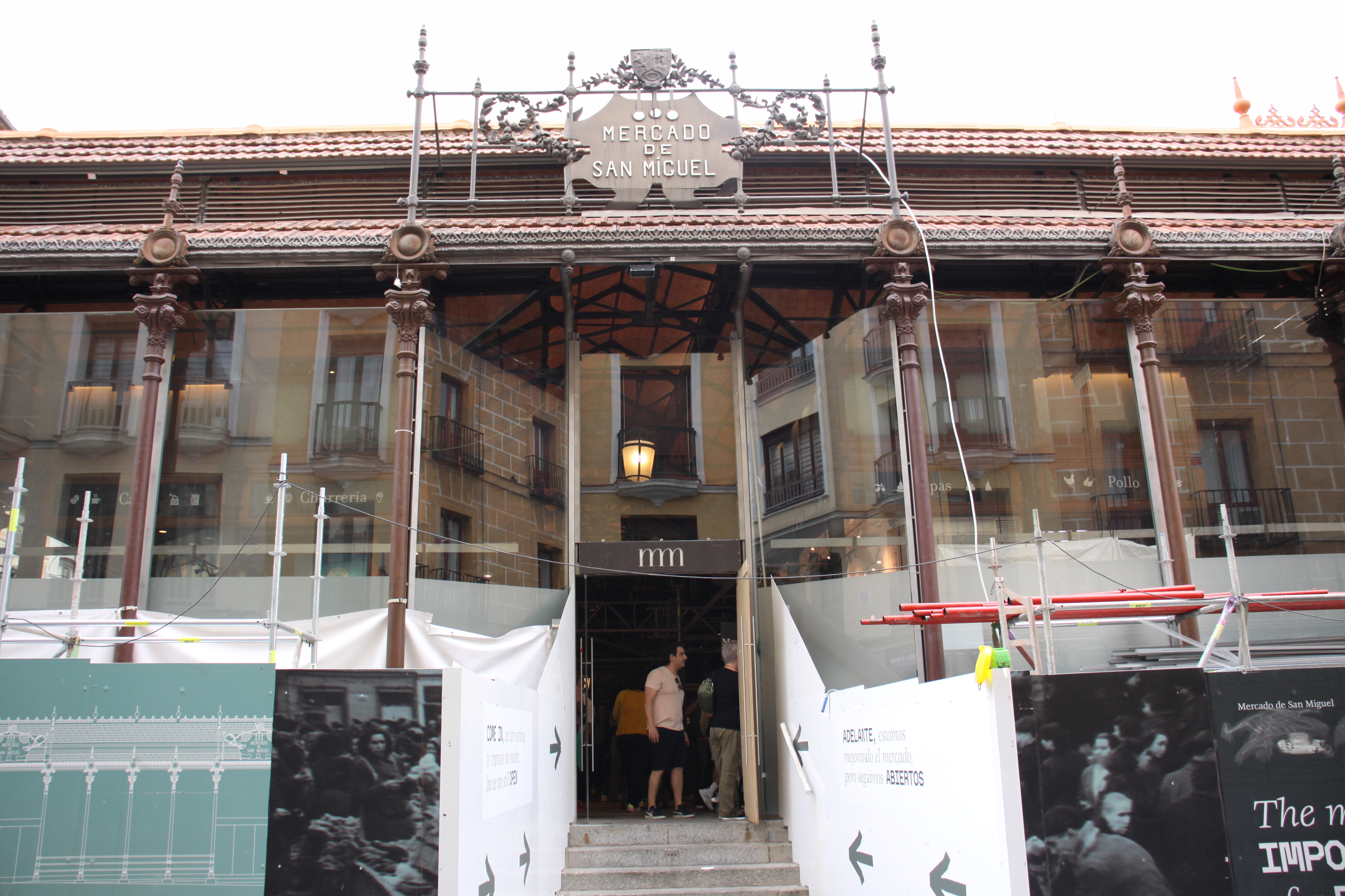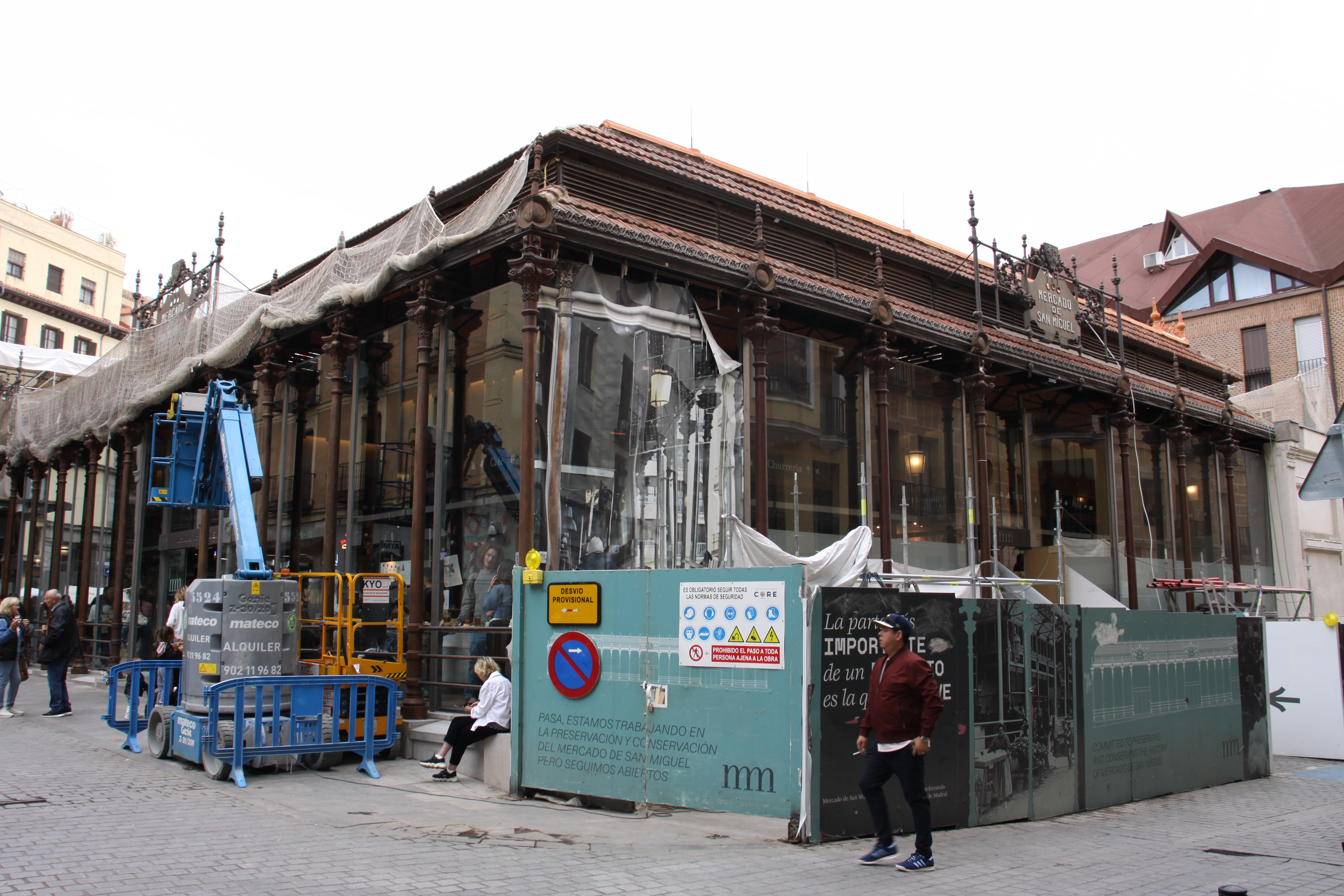 산 미구엘 광장을 들어선다. 꽃 장식과 간판이 예쁘다. 산 미구엘 재래시장으로 들어간다. 외부는 공사중이다. 산 미구엘 시장(Mercado de San Miguel)은 1916년경에 에펠에 의해 건설된 실내 시장이다.