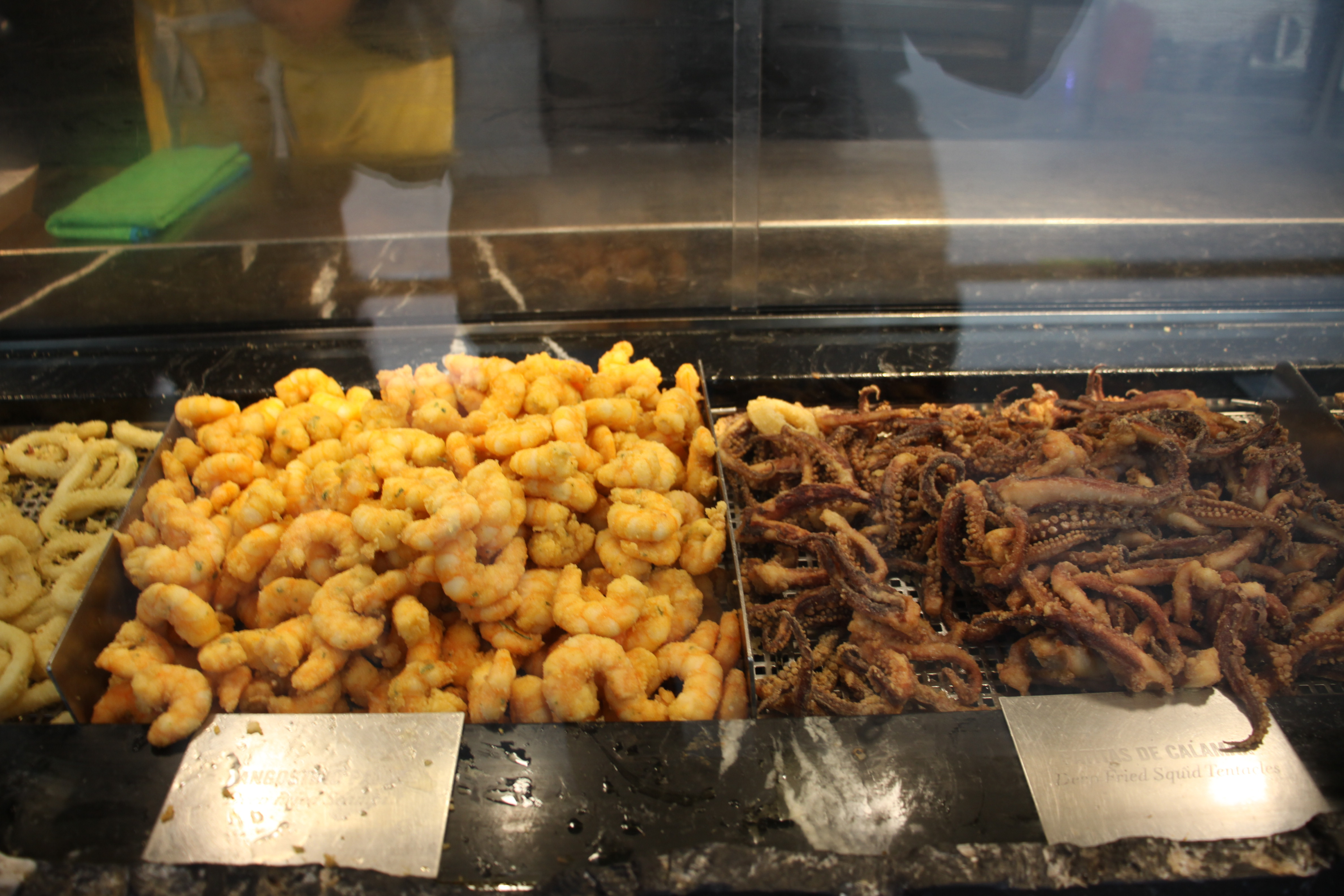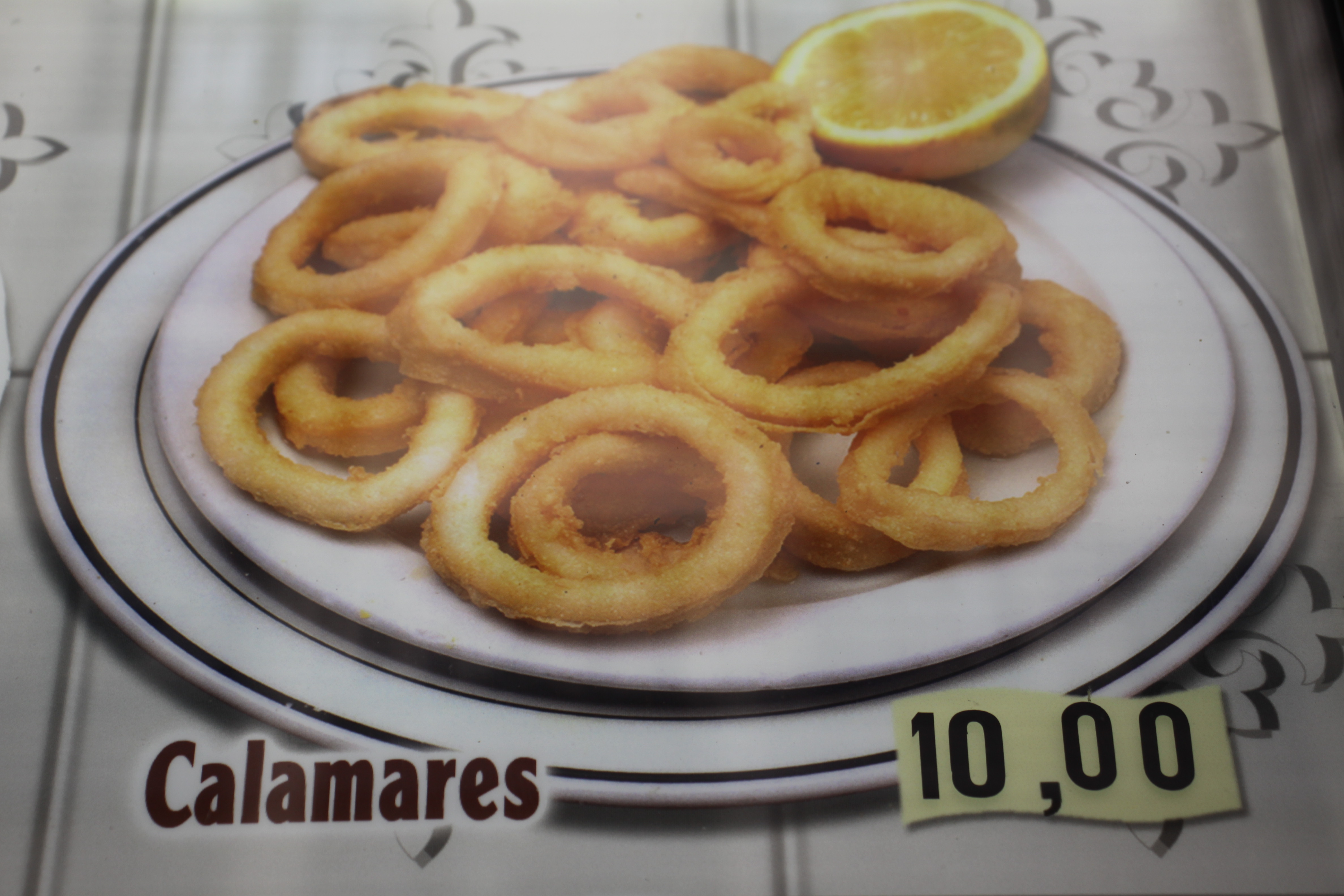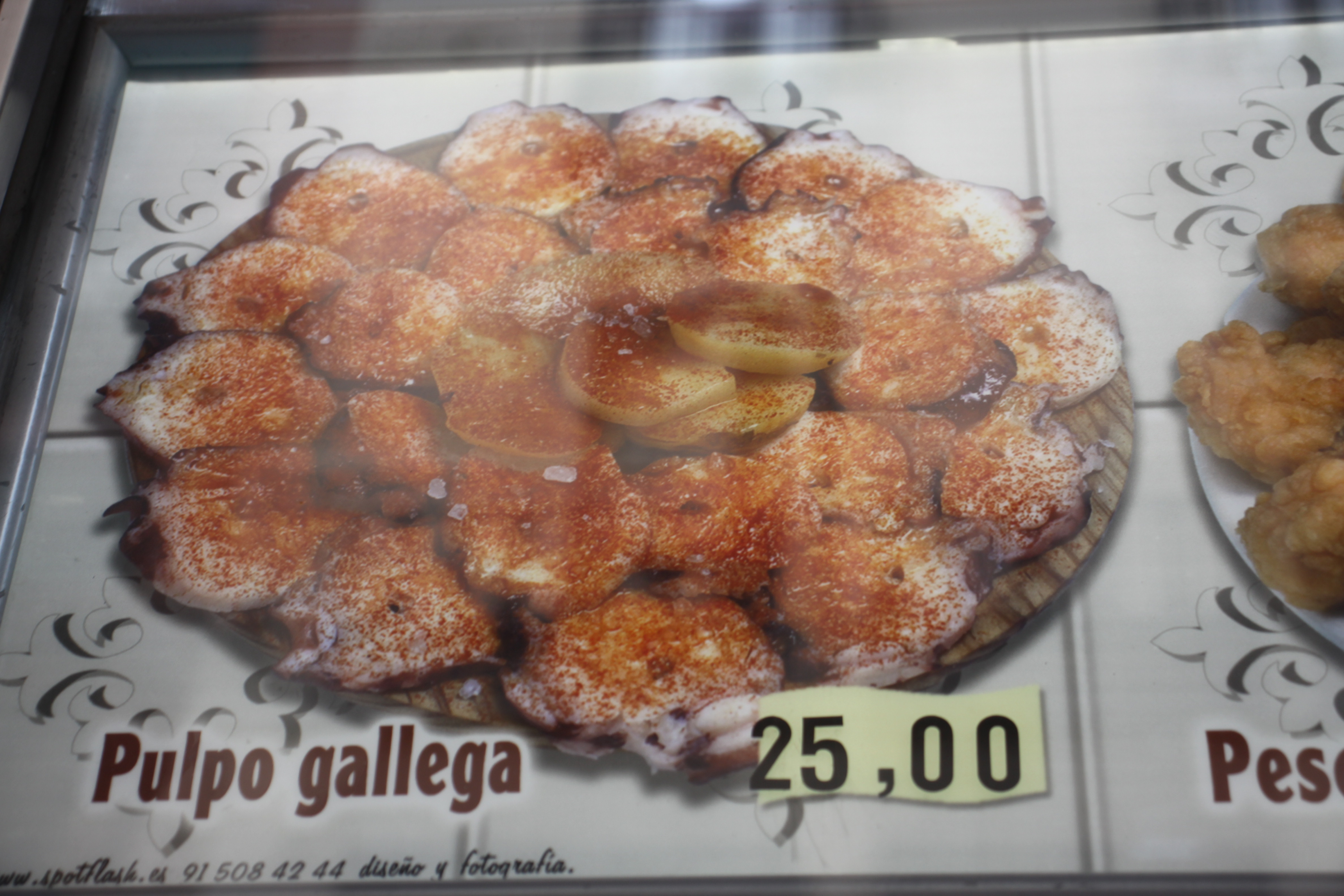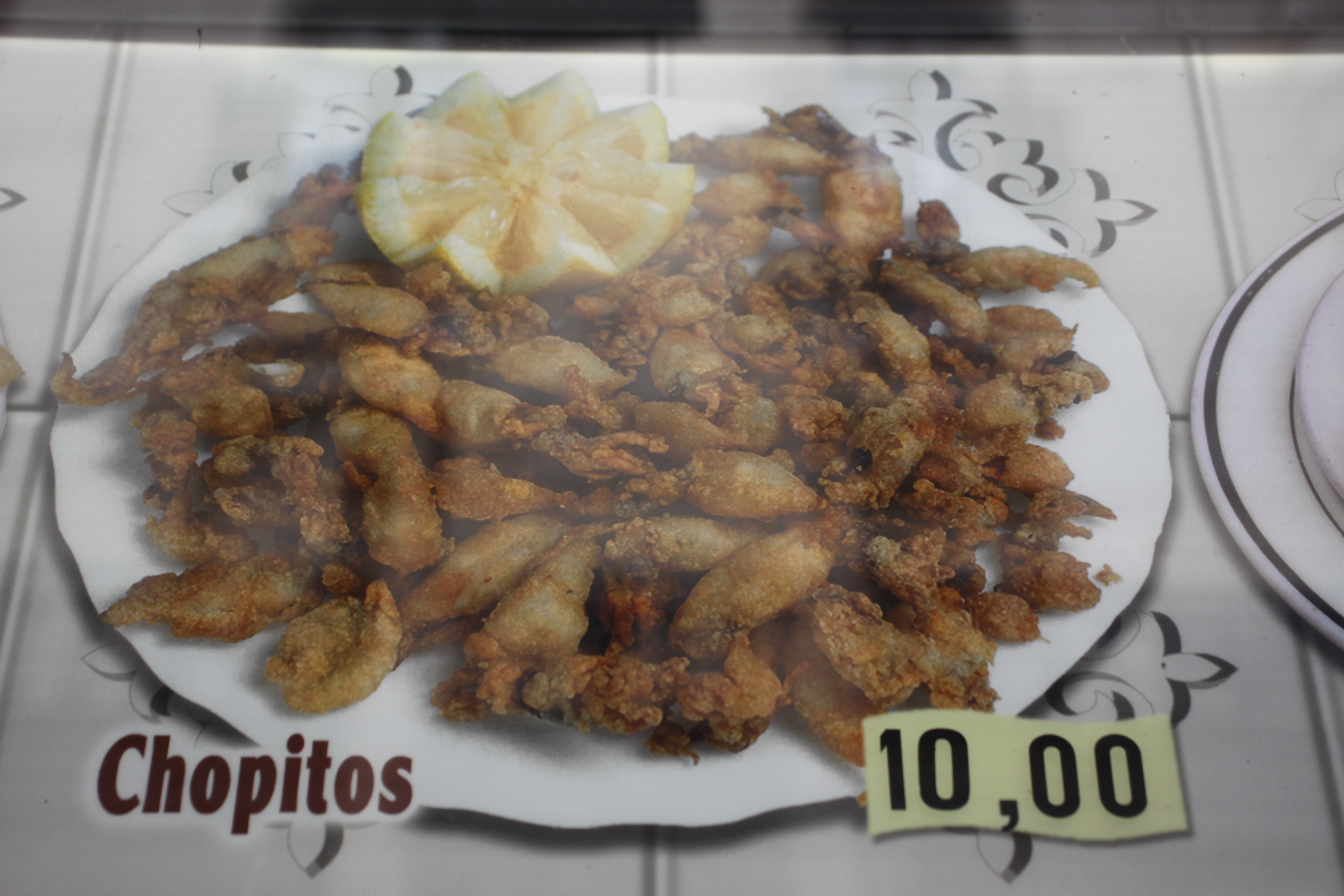 뽈뽀 문어 요리(pulpo gallega) 는 25유로, 초피토스(chopitos)꼴뚜기 볶음 요리는 10유로, 칼라마레스(Calamares) 오징어 튀김요리는 10유로, 좀 비싼 것 같다.
