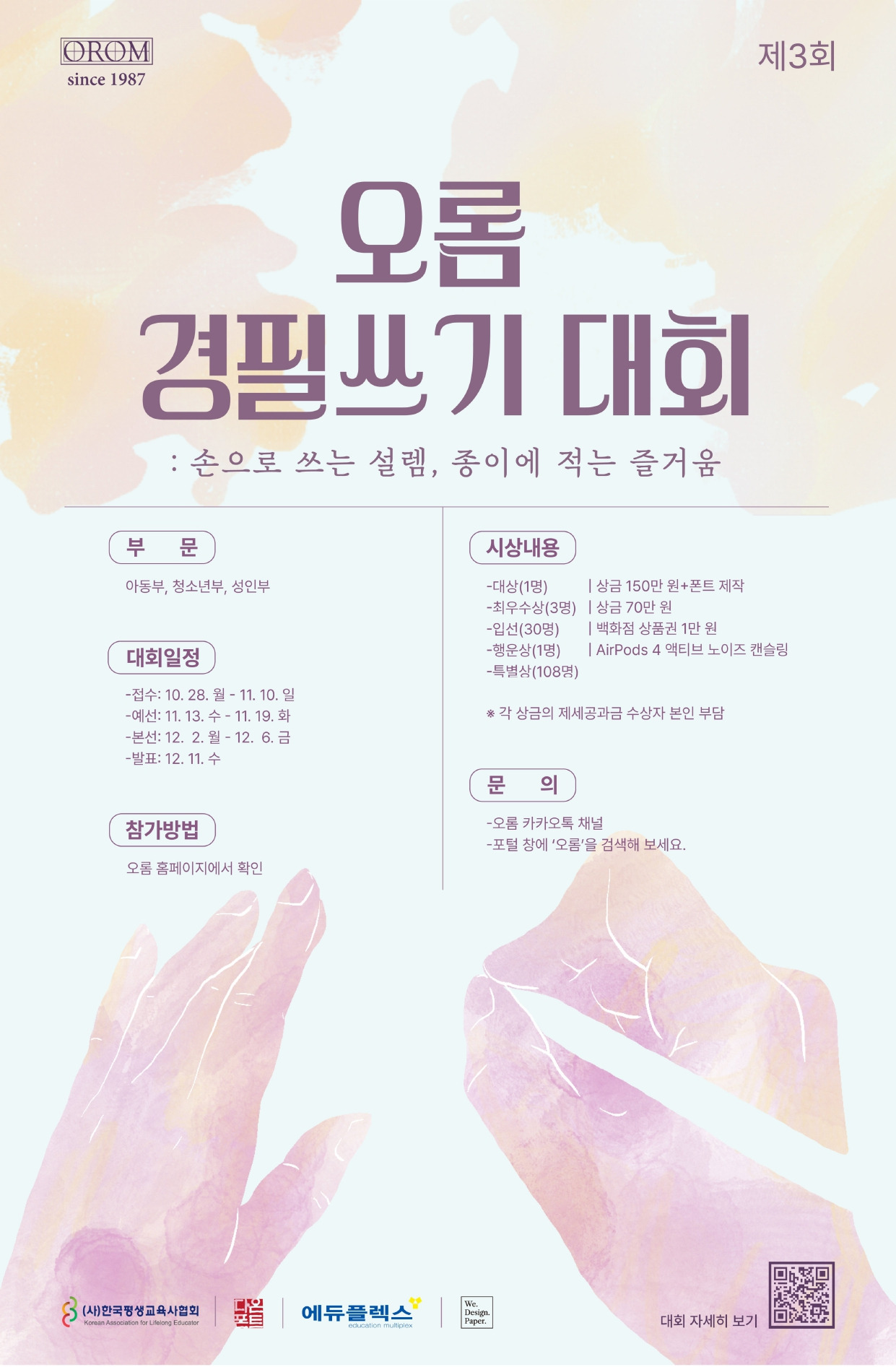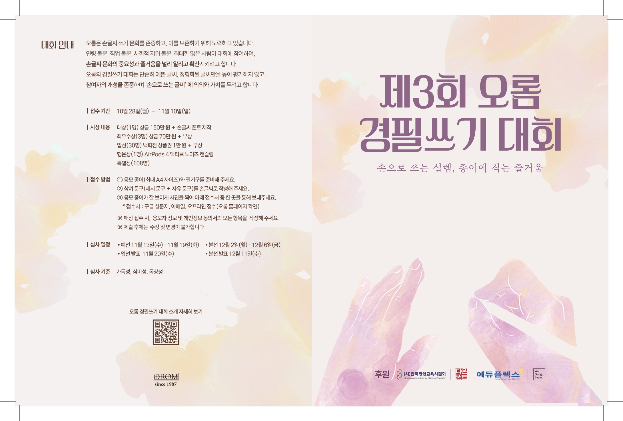 - 오롬의 경필쓰기 대회는 단순히 예쁜 글씨, 정형화된 글씨만을 높이 평가하지 않고, 참여자의 개성을 존중하며 ‘손으로쓰는글씨’ 에 의의와 가치를