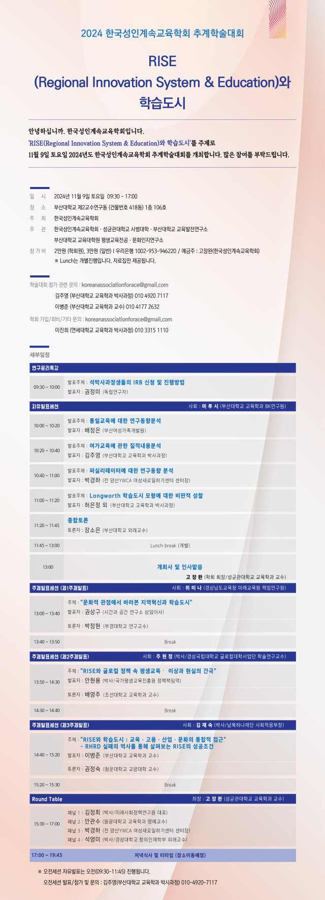 한국성인계속교육학회에서 'RISE(Regional Innovation System & Education)와 학습도시'를 주제로 오는 11월 9일 토요일 2024년도 학술대회를 개최합니다.