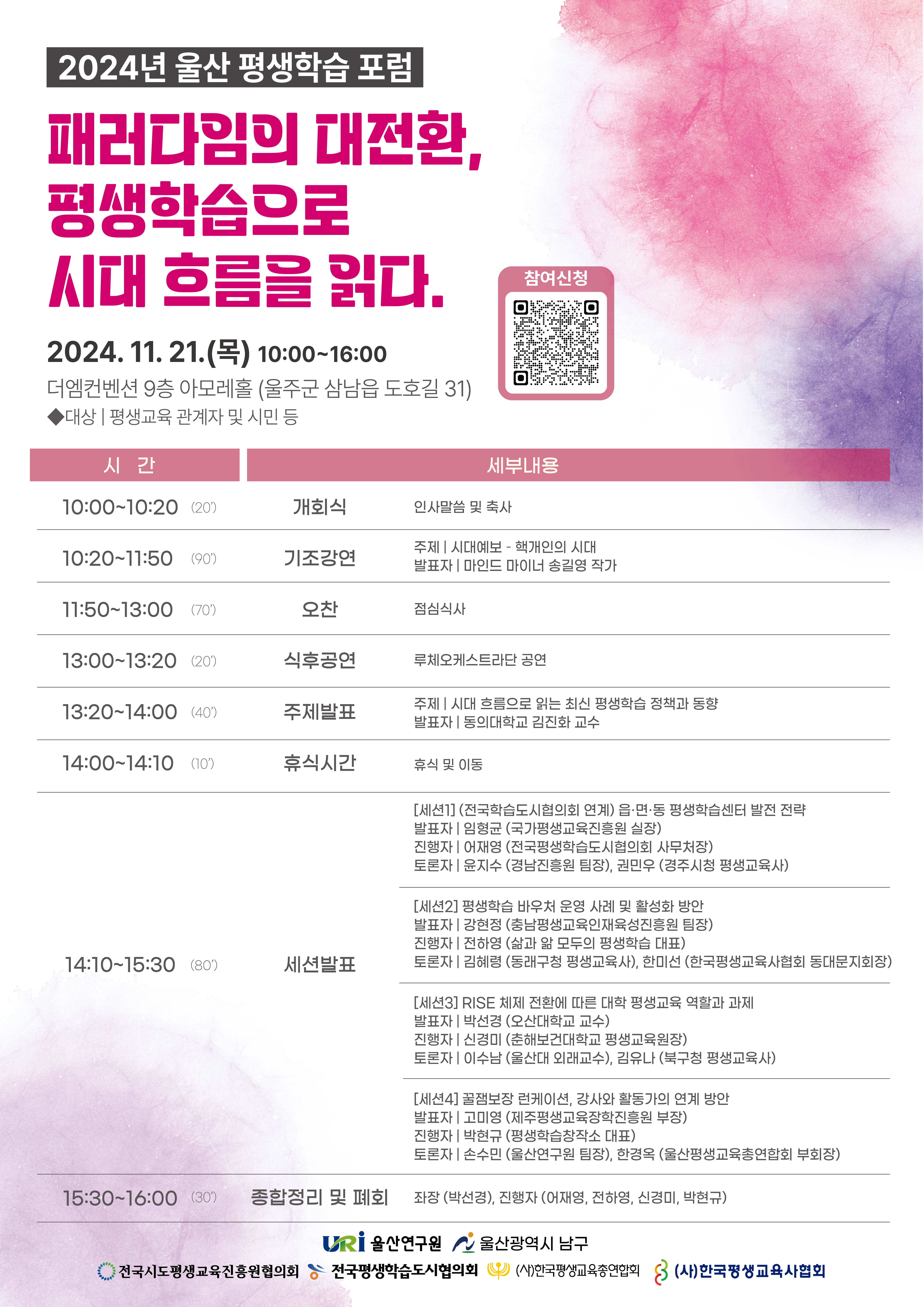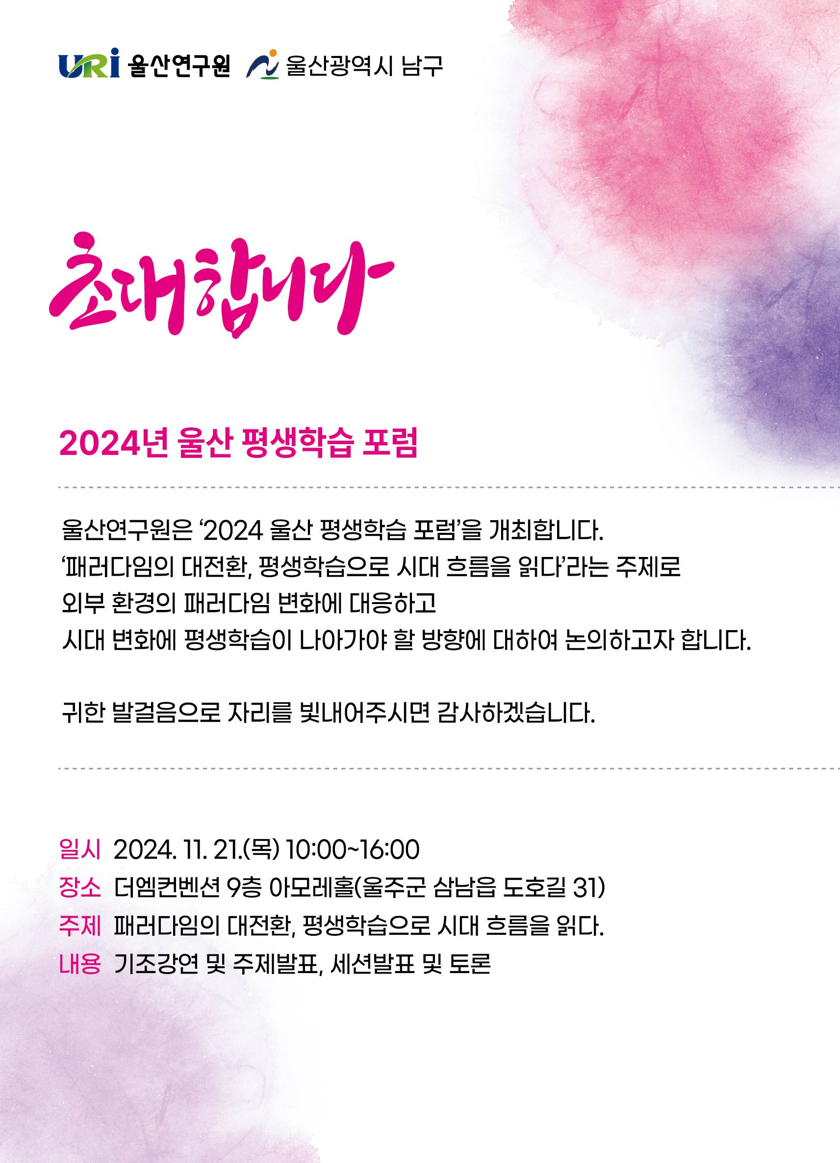 울산연구원에서 관내외 평생교육 주요 현안 공유 및 상호 교류의 장을 마련하고자 「2024 울산 평생학습 포럼」을 개최하고자 하오니, 평생학습관계자 여러분의 많은 참여 부탁드립니다.