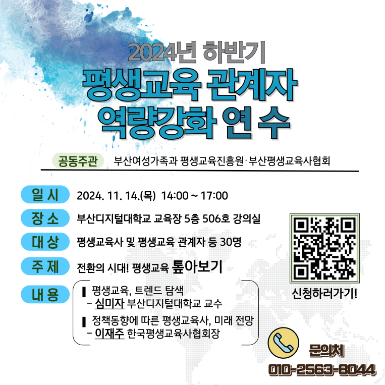 2024년 하반기 평생교육 관계자 역량강화 연수는 "전환의 시대! 평생교육 톺아보기"를 주제로 평생교육 현장에서 필요한 전문 지식과 역량을 강화하기 위해 마련되었습니다. 평생교육사 여러분의 많은 관심과 참여 부탁드립니다.