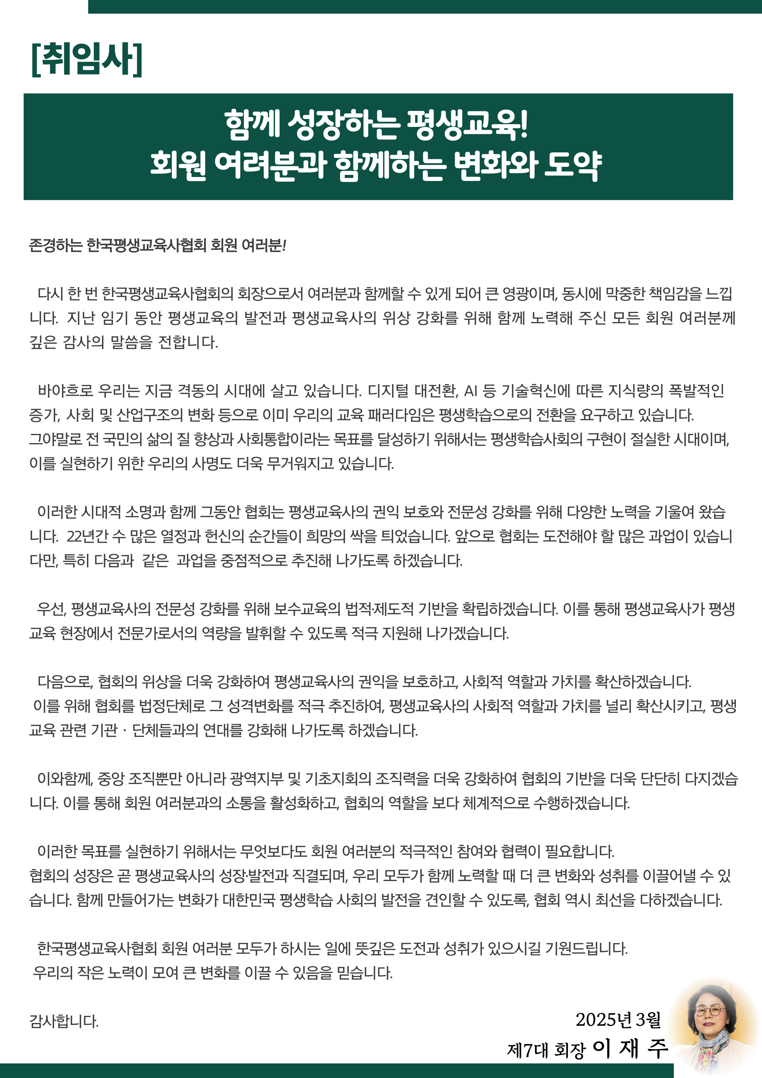 이재주 제7대 (사)한국평생교육사협회장 취임사 작성자(사)한국평생교육사협회|작성시간25.03.12|조회수85 목록 댓글 0 글자크기 작게가 글자크기 크게가 다음검색 현재 게시글 추가 기능 열기 북마크 공유하기 신고 센터로 신고 댓글 댓글 0 댓글쓰기 답글쓰기 댓글 리스트