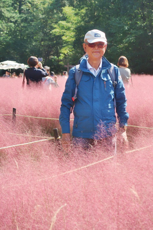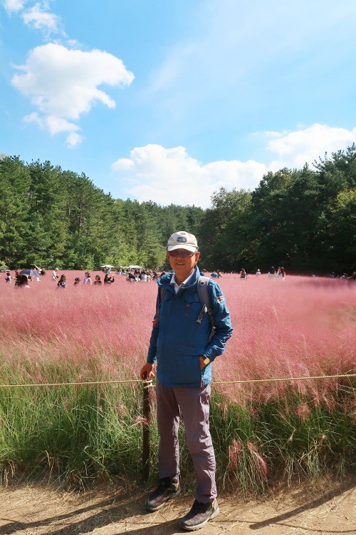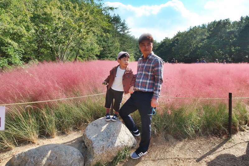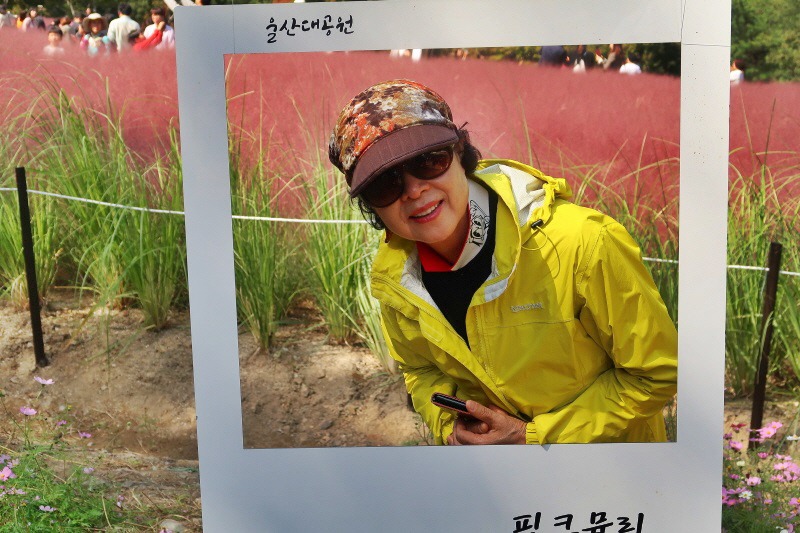 핑크뮬리를 배경으로 기념사진을 찍고 있다