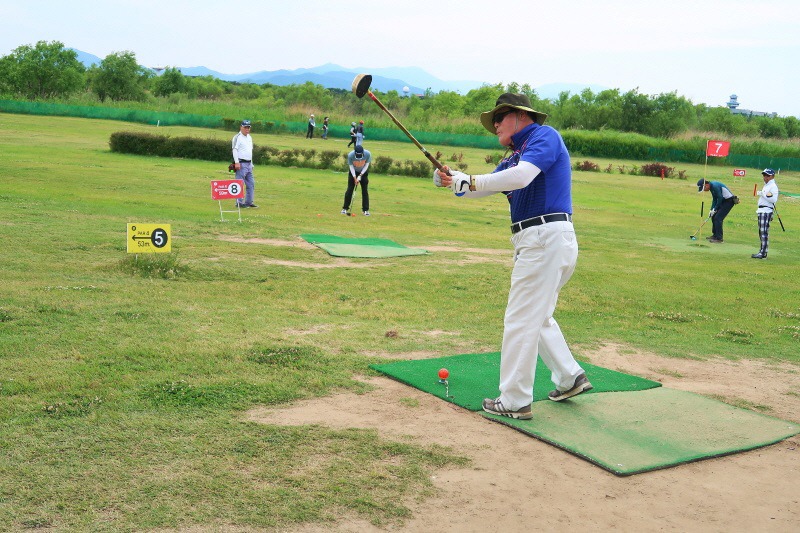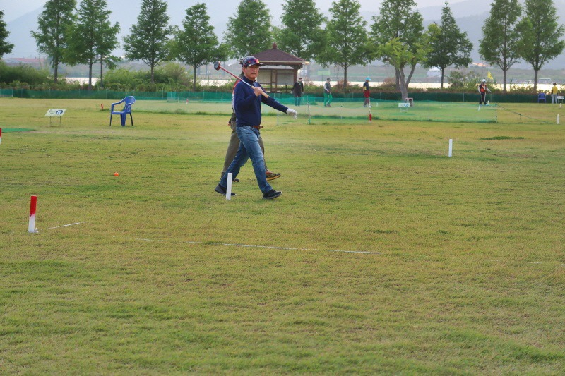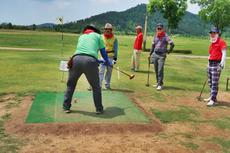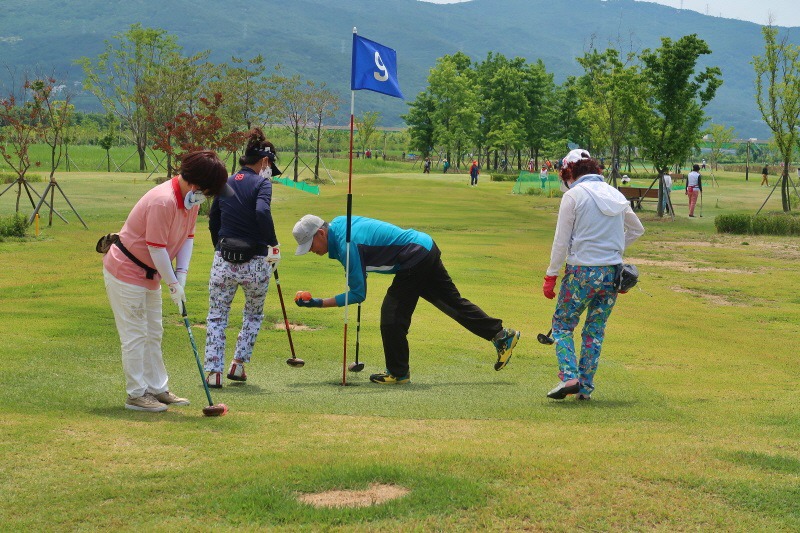 푸른 잔디에서 파크 골프를 즐기는 사람들 건강미가 넘쳐흐른다.