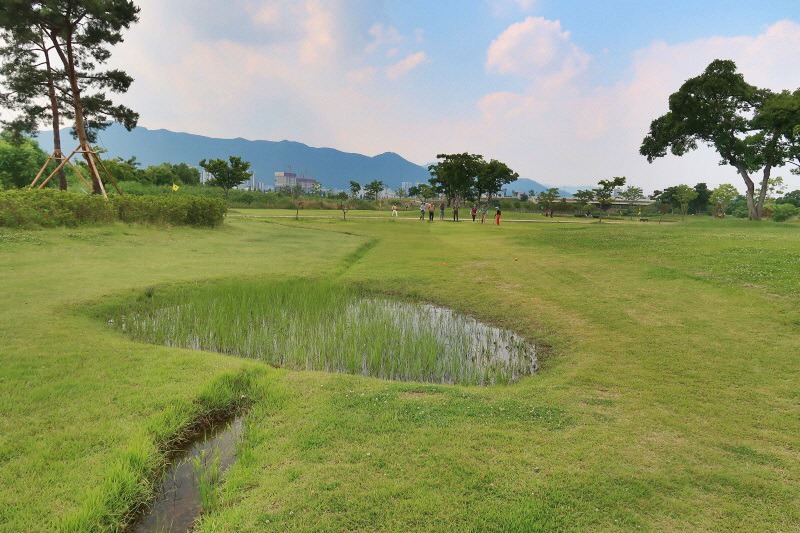 가산 파크골프 D 코스 내에 작은 연못이 있다. 맨발로 연못에 들어가 샷을 날리던 박세리 선수