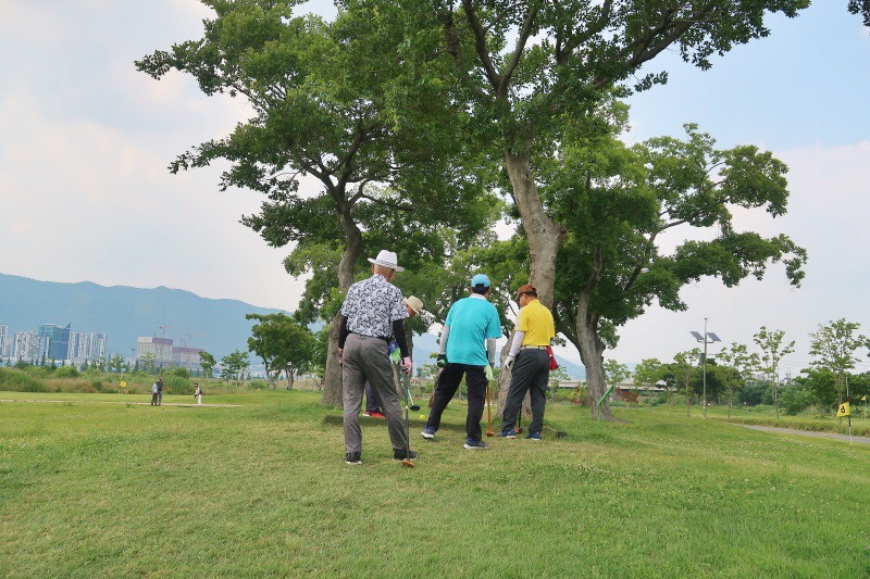 삼락공원 파크 골프장은 낙동강 둔치에 위치하여 강바람을 맞으며 푸른 잔디에서 공을 치면