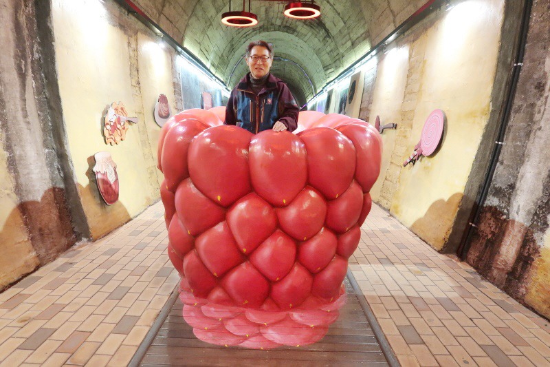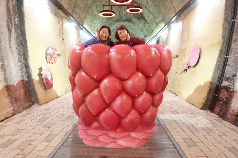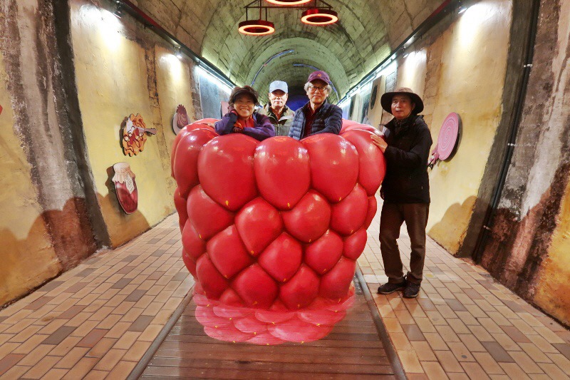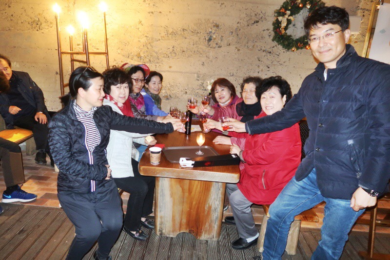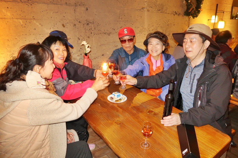 와인 동굴에서 산딸기 와인으로 건배, 안정학 봉사자가 전원에게 와인을 쏜다. 고맙습니다.