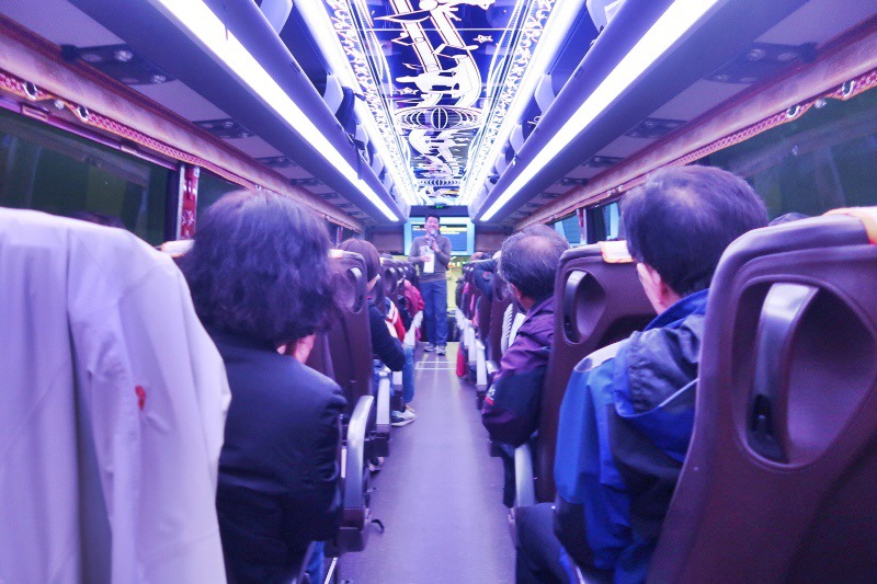 봉사단 51명은 관광버스와 봉고차 나누어 타고 목적지로 출발, 최동규 사무국장이 퀴즈 '골든벨'