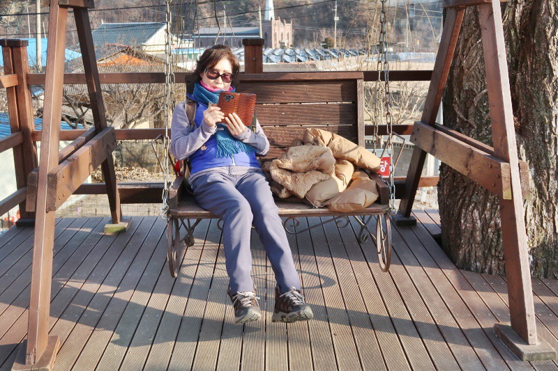 그네 의자에서 찍은 사진을 검색하는 강현자 회원의 유유자적한 모습