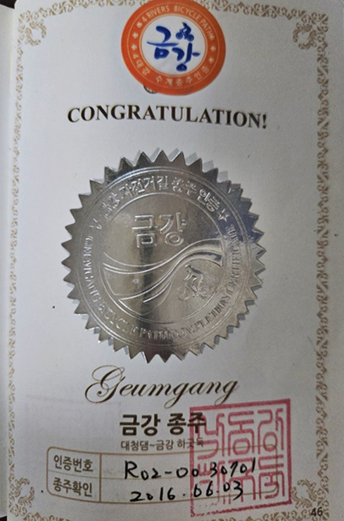금강을 종주한 인증스티커와 인증메달을 받아 흐뭇하다. 다음은 4대강 중 마지막 코스인 한강에 도전합니다.