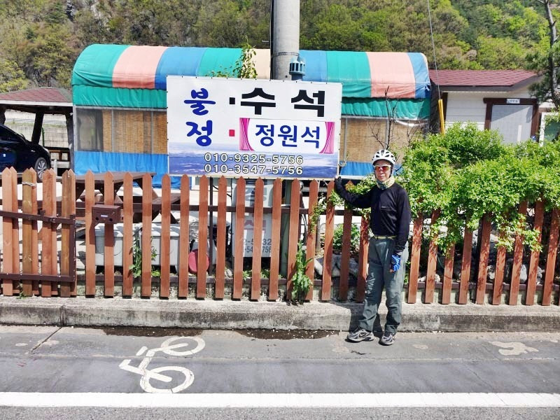 국토종주 자전거길 종주에 동행한 실버넷뉴스 정기자의 이름이 정원석이다 이곳 정원석은 정원(庭園)의 수석을 판매하는 조경업체 상호이다.