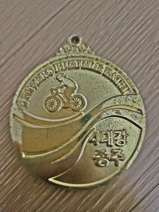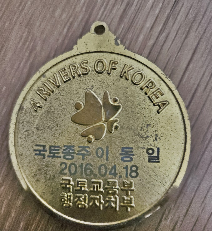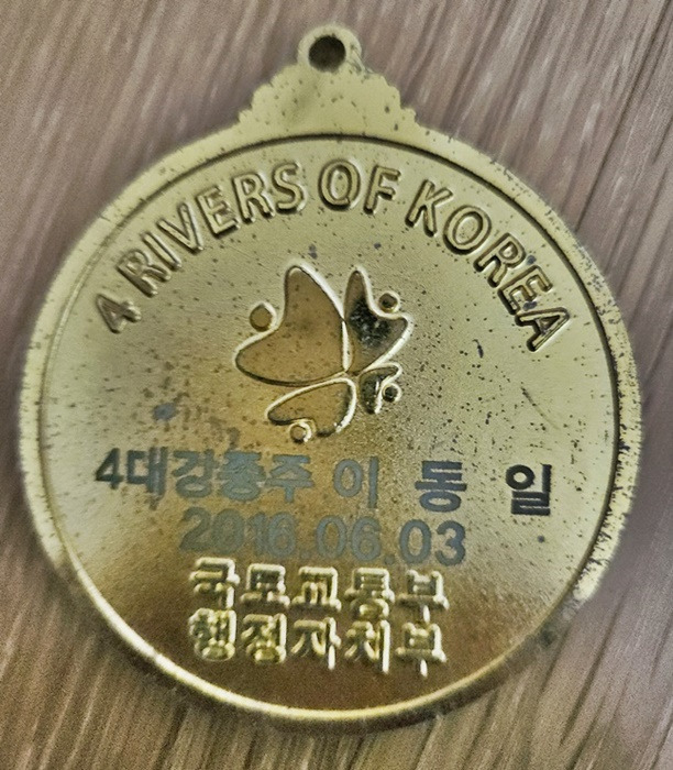 4대강종주 메달(上)전면, (下) 뒷면에 일자와 나의 이름이 기제되어있다.