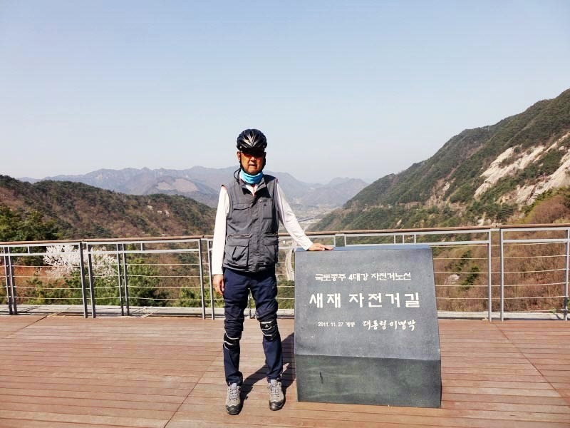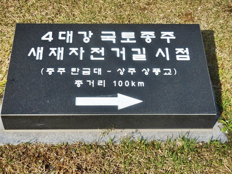 이화령 정상 중앙에 국토종주 4대강 자전거노선 새재 자전거길 표지석 설치되어 있다. 역시 이명박대통령의 흔적을 곳곳에서 볼 수 있다'