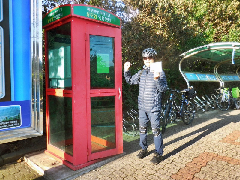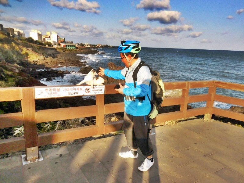 국토종주 자전거길을 7일간 마치고 제주환상의 자전거길을 종주하기 위해 서울에서 온 양제모(43세) 씨를 부산에서 만나, 정보를 공유하면서 동행하다. 용두암에서 고양이와 함께 놀고 있다.