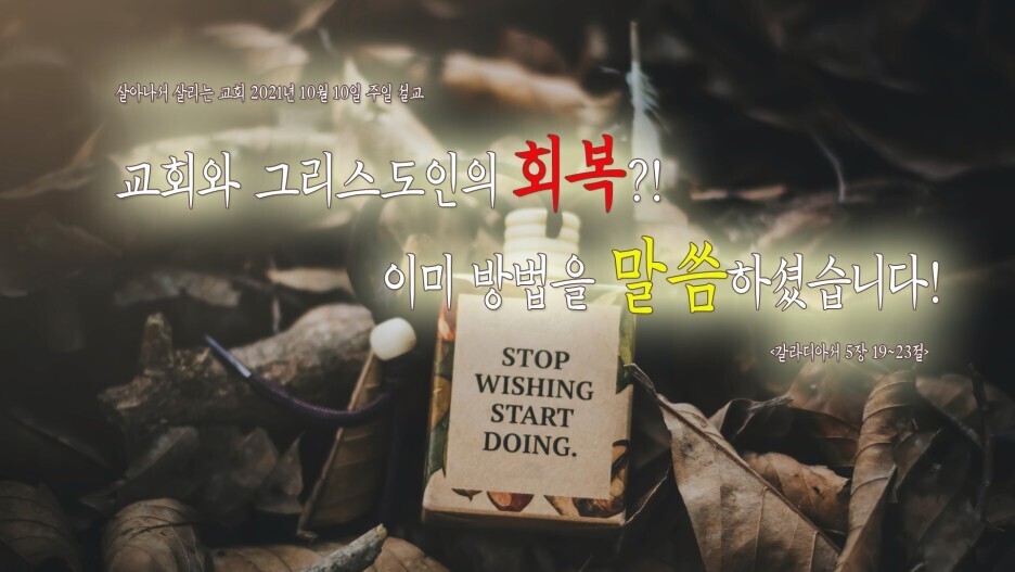 교회와 그리스도인들이 회복되기 위해서는 가장 먼저 '해야 할 일과 하지 말아야 할 일'에 대해서 분명하게 구별해야 한다고 생각합니다. 왜냐하면 해야 할 일은 하지 않았고, 하지 말아야 할 일은 꾸준히 해 온 결과가 2021년 10월 두 번째 주일을 맞이하고 있는 현재의 교회와 그리스도인들의 민낯을 드러냈다고 생각하기 때문입니다. 그러니 다시금 말씀을 의지하고 순종하여 '해야 할 일과 하지 말아야 할 일'에 대한 분명한 구분을 깨닫고, 구분하여 사는 것이 최우선의 과제가 되어야 하는 것입니다.