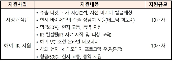 - 시장개척단, 해외 IR 지원 중 택1 하여 지원 가능, 심사 시 2개 사업을 동시에 신청한 업체는 지원 제외
