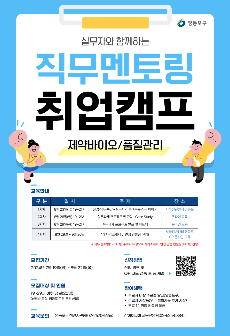 [영등포구] 「실무자와 함께하는 직무 멘토링 취업캠프: 제약바이오/품질관리 직무」(~8/22 영등포 구민 우선 선발)