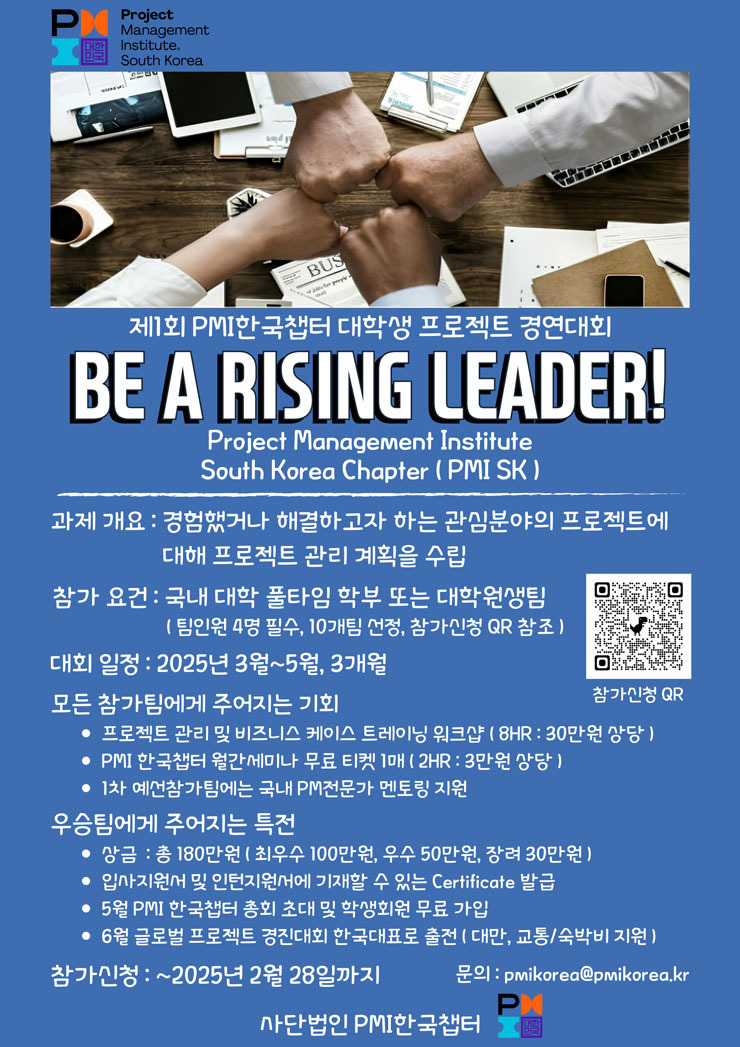 - 예선참가 팀에는 감사장/인증서, PMI 한국챕터 학생회원 자격 부여.