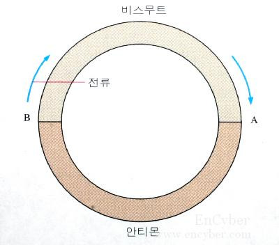 1834년 J.C.A.펠티에가 발견한 열전현상(熱電現象)으로 예를 들면 비스무트와 안티몬을 접속하여 전류를 화살표 방향으로 흐르게 하면, 전류가 비스무트에서 안티몬으로 향하는 접점 A에서는 온도가 내려가고, 다른 접점 B에서는 온도가 올라간다. 또 전류를 반대로 흐르게 하면 A에서는 온도가 올라가고, B에서는 내려간다. 이것은 이종(異種)인 금속에서는 금속 내의 전자의 퍼텐셜에너지에 차가 있기 때문에 퍼텐셜에너지가 낮은 상태에 있는 금속으로부터 높은 상태에 있는 금속으로 전자를 운반하는 데는, 외부로부터 에너지를 얻어야 할 필요가 있으므로, 접점에서 열에너지를 빼앗기고, 반대의 경우에는 열에너지가 방출되게 된다. 하고, 그 크기는 두 금속의 전자 퍼텐셜에너지의 차에 해당하는 열전력(熱電力)과 절대온도에 비례한다. 펠티에효과는 전자를 작업물질로 하는 열펌프효과로 간주되며, 적당한 열전소자(熱電素子)들로 구성해 냉각장치로 이용할 수 있다. 전자냉동(電子冷凍) ·전자냉방 등은 이 종류의 장치인데, 보통 이극형 반도체(異極型半導體)를 조합했을 때에 생기는 냉각효과를 이용하고 있다. |
