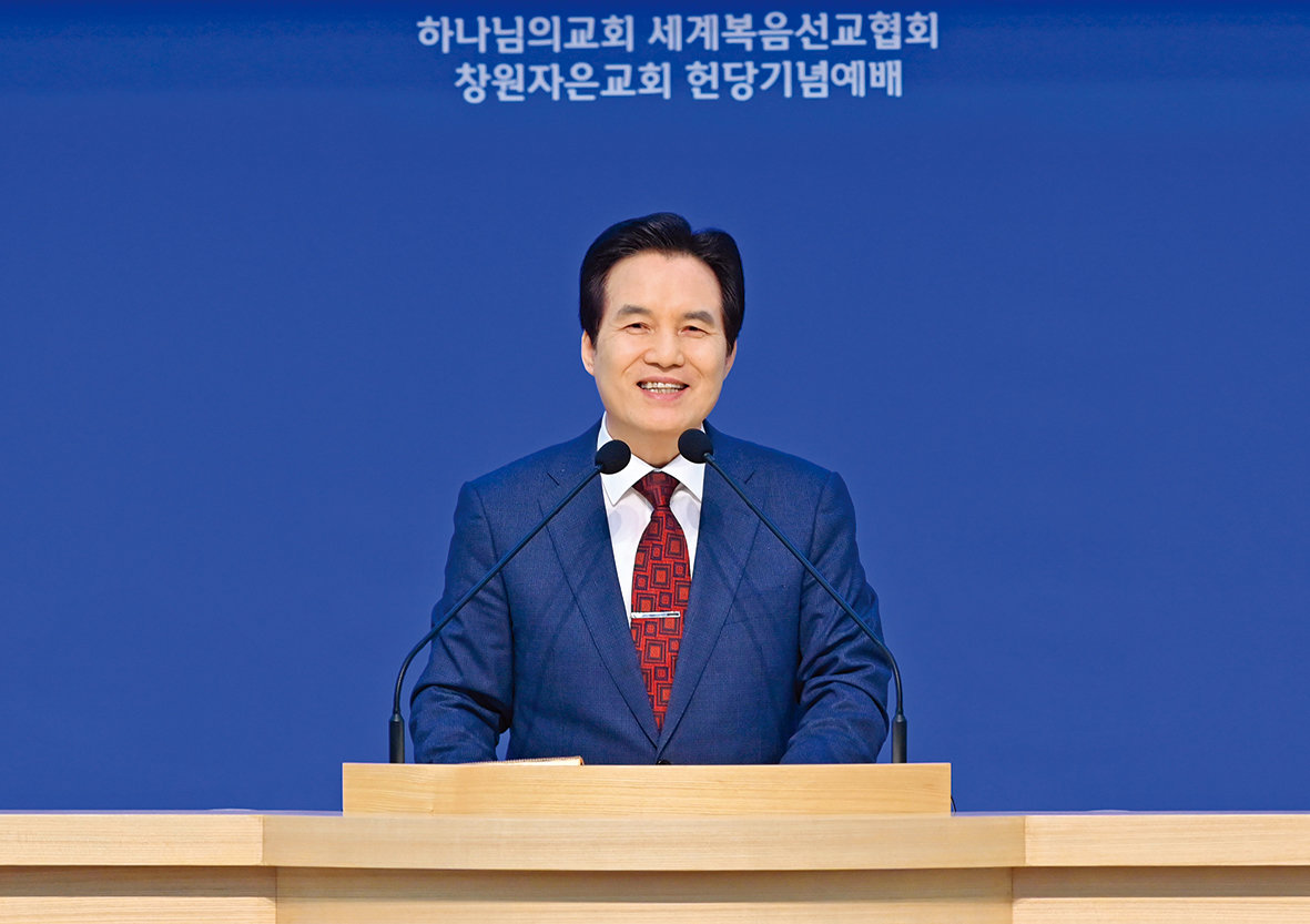 ‘창원자은 하나님의 교회’ 헌당기념예배에서 설교 중인 총회장 김주철 목사. 하나님의 교회 제공