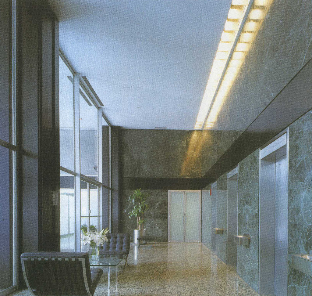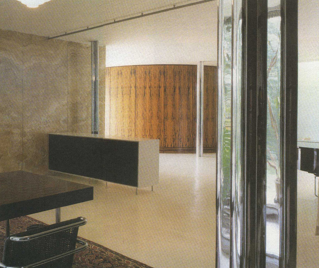 │크롭 도금된 기둥과 자유롭게 선 패널로 처리된 내부는 바르셀로나 세계박람회 독일관을 연상시킨다. 여기에서도 그의