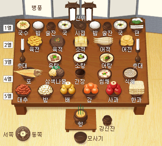 그래서 우리 조상들은 집과 방의 방향에 상관없이 신위가 있는 곳을 북쪽이라 생각하고 제관이 신위 쪽을 바라보아서 오른쪽이 동쪽이 이라고 생각하여 제사상을 차리는 것이 편리함을 알게 되었습니다.