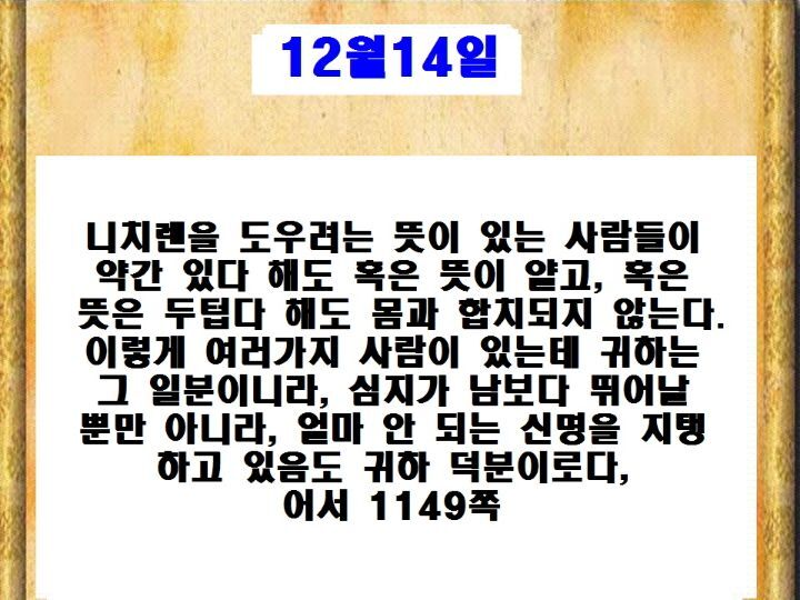 오늘의 어서 12.14 작성자朴靑春|작성시간25.12.14|조회수24 목록 댓글 0 글자크기 작게가 글자크기 크게가 다음검색 현재 게시글 추가 기능 열기 북마크 공유하기 신고 센터로 신고 댓글 댓글 0 댓글쓰기 답글쓰기 댓글 리스트