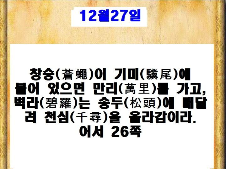 오늘의 어서 12.27 작성자朴靑春|작성시간07:41|조회수5 목록 댓글 0 글자크기 작게가 글자크기 크게가 다음검색 현재 게시글 추가 기능 열기 북마크 공유하기 신고 센터로 신고 댓글 댓글 0 댓글쓰기 답글쓰기 댓글 리스트