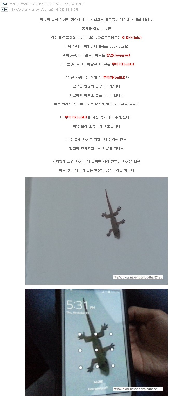 [필리핀 생활] 행운의 상징 뿌띠키(butiki)를 아시나요?? 작성자유노바교|작성시간15.05.27|조회수139 목록 댓글 0 글자크기 작게가 글자크기 크게가 다음검색 현재 게시글 추가 기능 열기 북마크 공유하기 신고 센터로 신고 댓글 댓글 0 댓글쓰기 답글쓰기 댓글 리스트