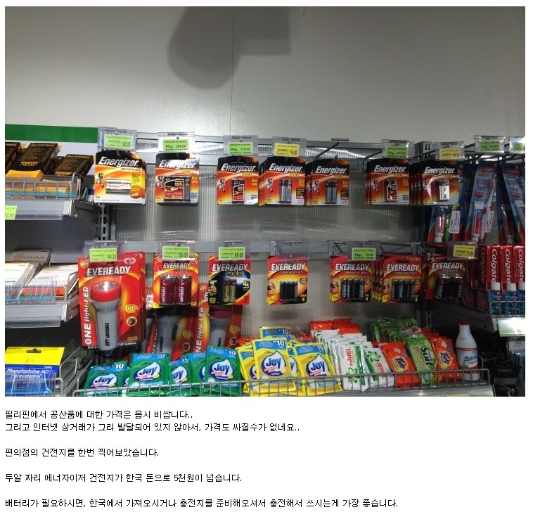 필리핀에서 건전지(배터리) 가격은 얼마일까? 작성자유노바교|작성시간15.06.06|조회수111 목록 댓글 0 글자크기 작게가 글자크기 크게가 다음검색 현재 게시글 추가 기능 열기 북마크 공유하기 신고 센터로 신고 댓글 댓글 0 댓글쓰기 답글쓰기 댓글 리스트