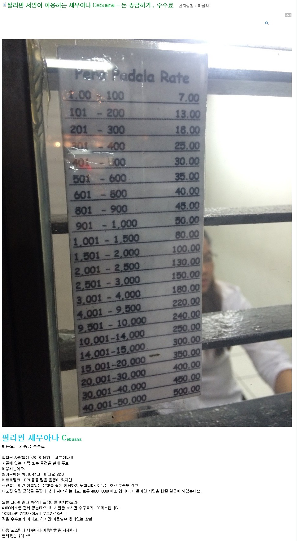 필리핀 서민이 이용하는 세부아나 Cebuana - 돈 송금하기 , 수수료 작성자유노바교|작성시간15.06.07|조회수181 목록 댓글 0 글자크기 작게가 글자크기 크게가 다음검색 현재 게시글 추가 기능 열기 북마크 공유하기 신고 센터로 신고 댓글 댓글 0 댓글쓰기 답글쓰기 댓글 리스트