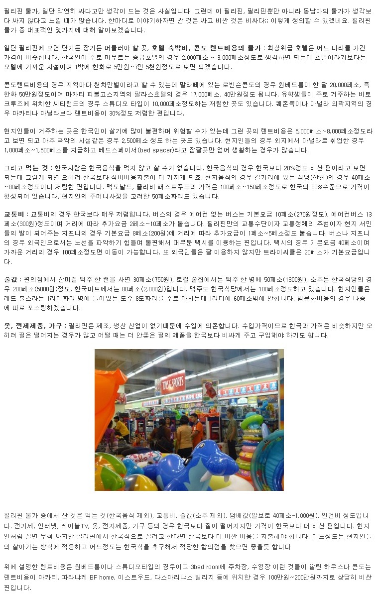[필리핀 물가] 필리핀 생활물가와 체감물가 작성자유노바교|작성시간17.04.03|조회수180 목록 댓글 0 글자크기 작게가 글자크기 크게가 다음검색 현재 게시글 추가 기능 열기 북마크 공유하기 신고 센터로 신고 댓글 댓글 0 댓글쓰기 답글쓰기 댓글 리스트