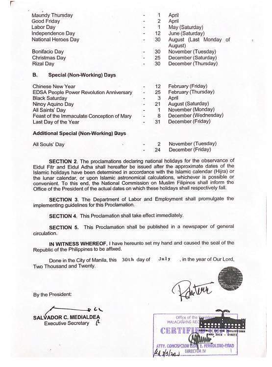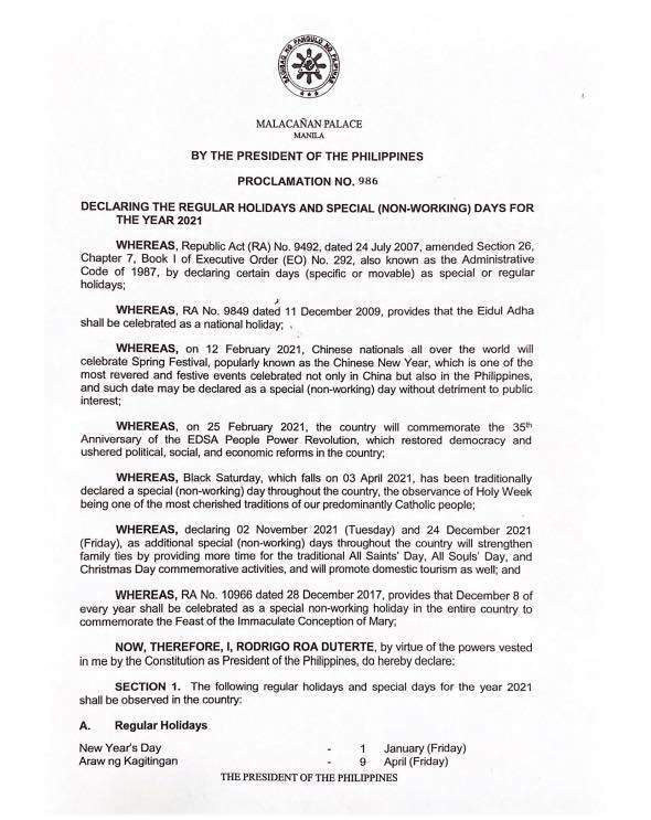 [사진출처: 대통령궁]Proclamation No. 986 declaring the regular holidays and special (non-working) days for 2021