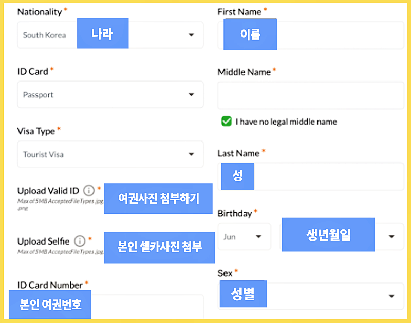 이름, 성, 생년월일, 성별 여권번호를 등을 넣어주세요!